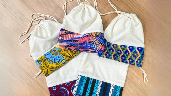 2025年度は22cm×18.5cmのアフリカ布をあしらった巾着袋のお届けを予定しております。