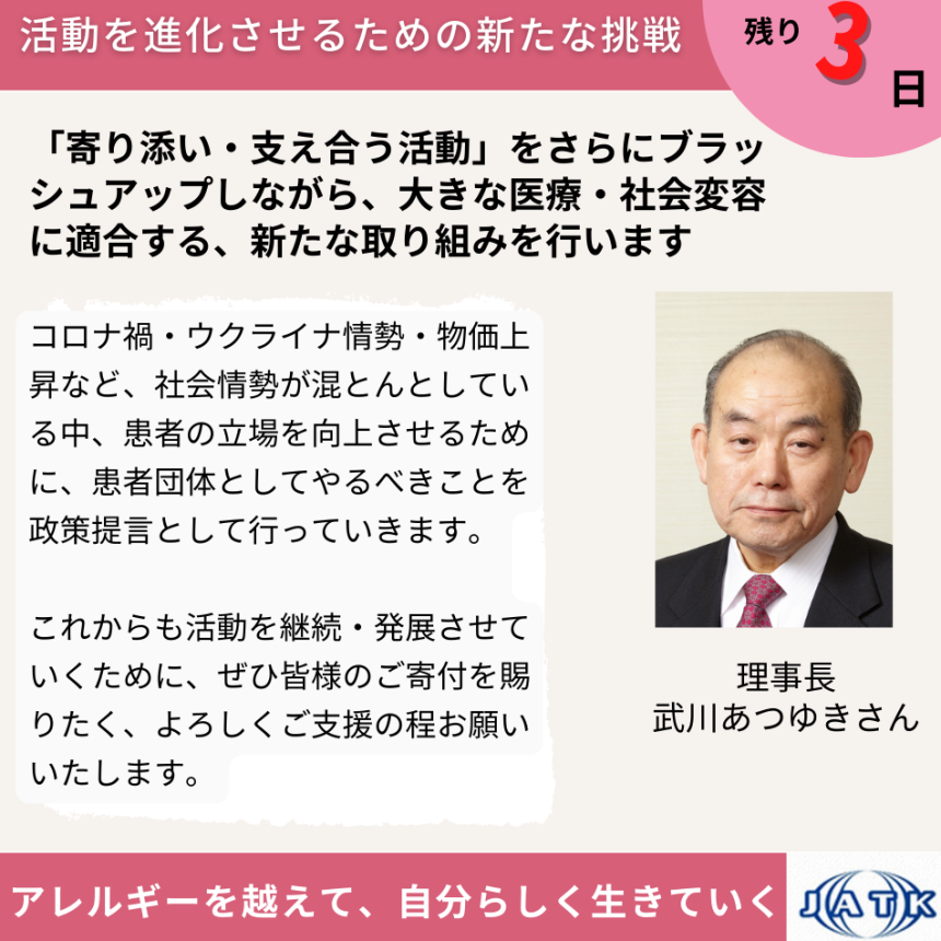 患者互助会からスタートした日本アレルギー友の会は、53年目を迎え、「寄り添い・支え合う活動」をさらにブラッシュアップしながら、大きな医療・社会変容に適合する、新たな取り組みが必要であると考えます。