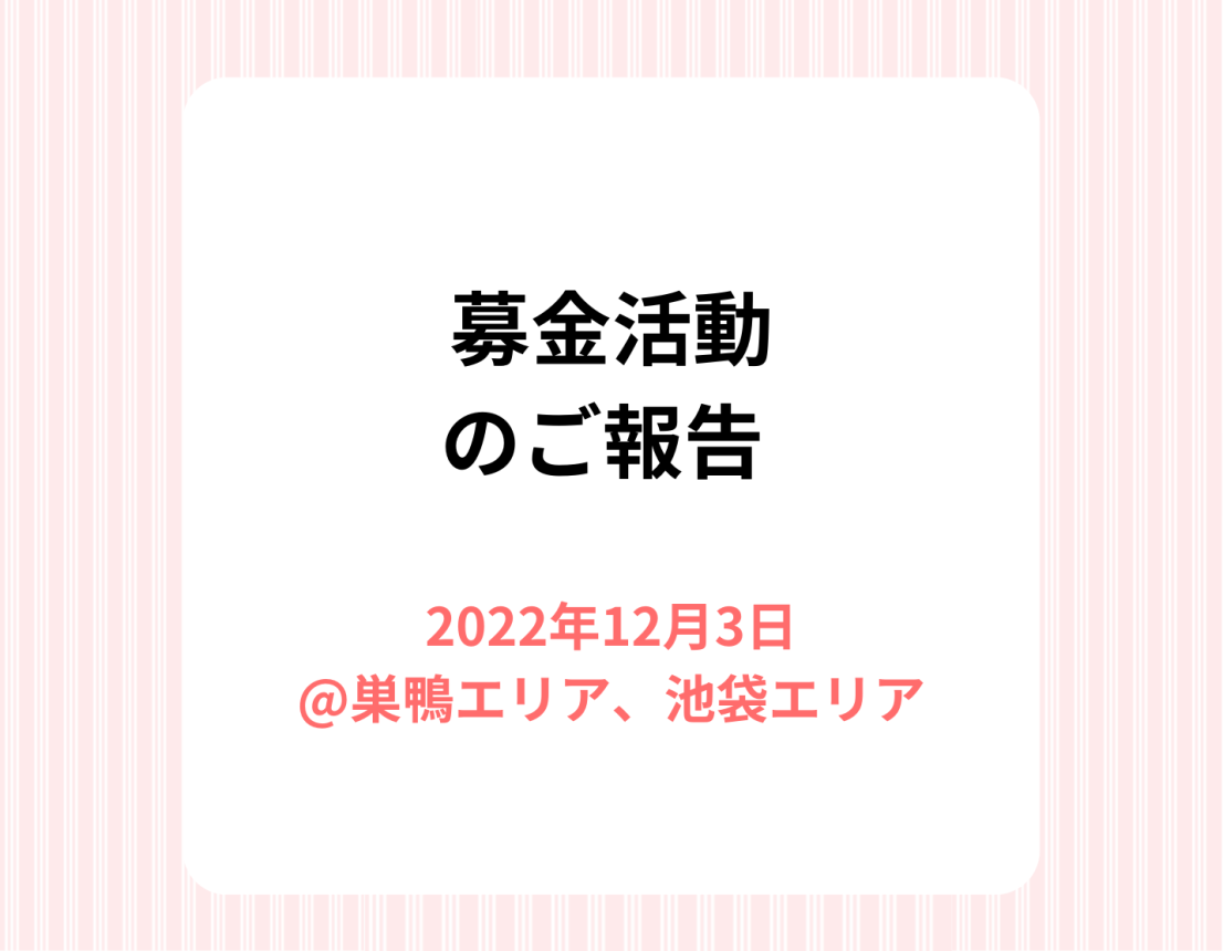 12月3日、巣鴨駅北口と池袋駅東口ニトリ近くで募金活動を行いました。今回の募金では、HPから募集していた方々にもボランティアでご参加いただきました。ご夫婦やパパ・娘といったご家族でのご参加、友達同士や中学生お一人でのご参加等、皆さま、ご協力ありがとうございました。