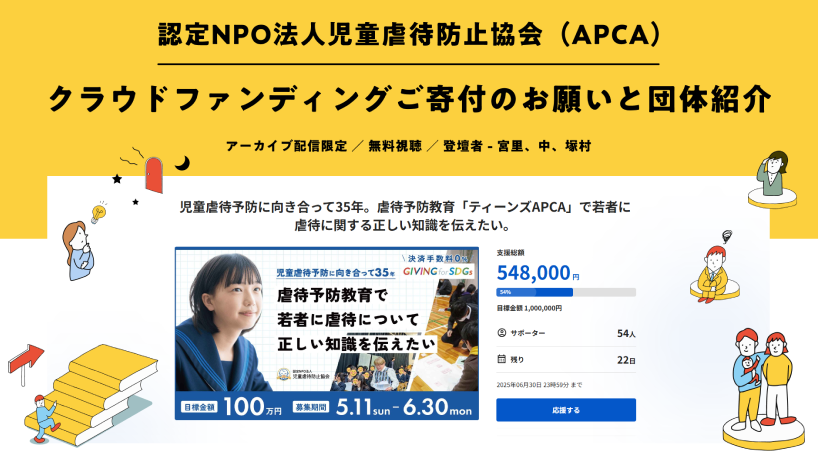 本ページでは、クラウドファンディングを立ち上げた理由や、児童虐待防止のために私たちが今、特に力を入れていきたいと思っている「ティーンズAPCA」事業のこと。