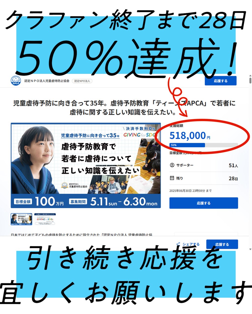 日本ではじめて子どもの虐待を防止するために設立された「認定NPO法人 児童虐待防止協会」。 35周年を迎える今年、はじめてのクラウドファンディングに挑戦いたします。 本ページでは、クラウドファンディングを立ち上げた理由や、児童虐待防止のために私たちが今、特に力を入れていきたいと思っている「ティーンズAPCA」事業のこと。 他にも団体の紹介や皆さまに伝えたいことを書いています。 私たちの活動を知っている方にも、これからという方にもぜひ読んでほしい内容となっていますので、ぜひ最後までお読みください。 そして、よければ、SNS等でシェア、拡散をお願いいたします。 ご家族やご友人にもご紹介ください。 どうぞよろしくお願いいたします。