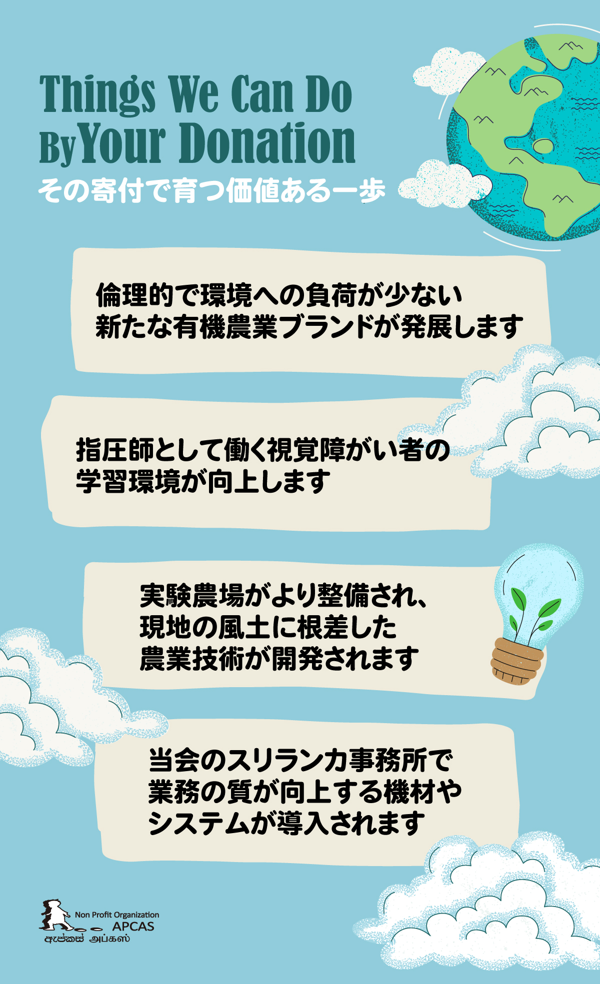 いただいた寄付については、ソーシャルビジネスを将来にわたって継続していくために欠かせないスリランカ側の「人材の育成」やブランド向上に欠かせない「技術やノウハウの蓄積」目的に使用します。