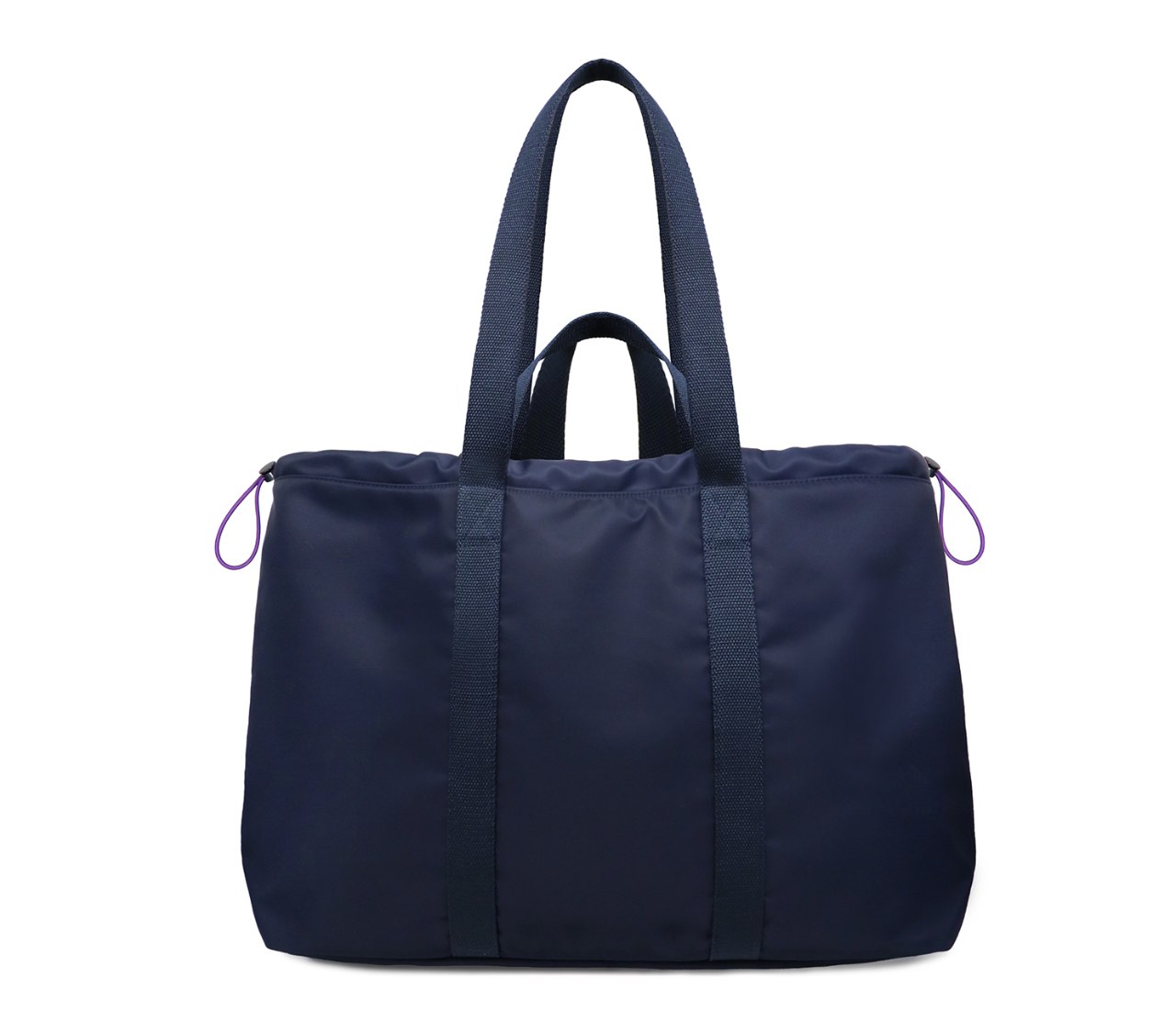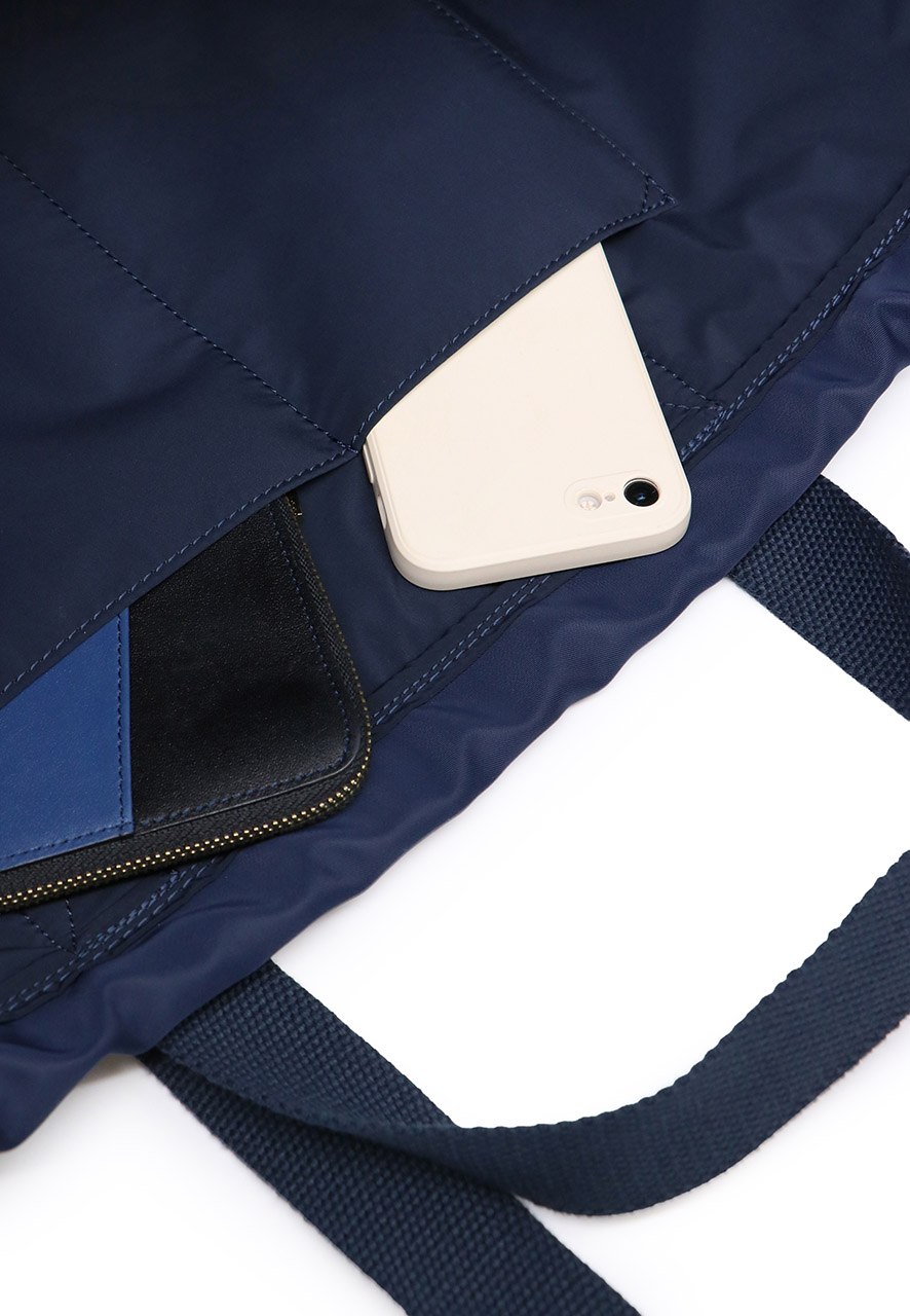 【機能面の特徴】 サイドのドローストリングを調整することで、バッグの形状と容量をその場の状況に合わせて変更できます。また、ダブルハンドルにより、肩掛けと手持ちを切り替えることが可能です。さらに、底鋲(そこびょう)を配置しているため、テーブルや地面に置いた際にも安定し、底面が汚れにくいデザインになっています。