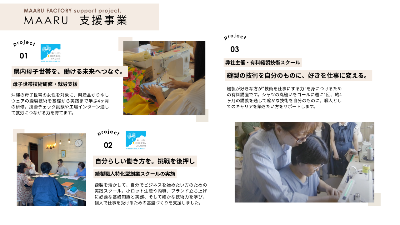 2024年・2025年には、眠っている預金を社会のために活かす仕組み「JANPIA(休眠預金活用事業)」の支援を受け、母子家庭や寡婦の暮らしを支える「沖縄県母子寡婦福祉連合会」や、制服や衣類を製造する事業者の集まりである「沖縄県衣類縫製品工業組合」と力を合わせて、シングルマザーの皆さんを対象に、縫製技術を学べる研修や就労につながるサポートを行ってきました。