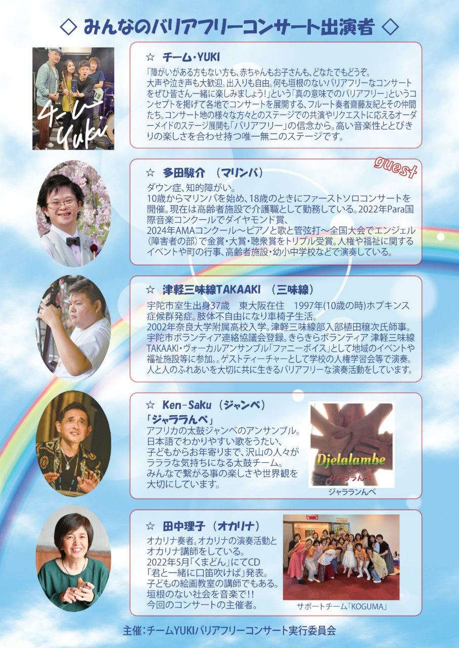 ■出演 ゲスト・プロ奏者:齋藤友紀(フルート)、金益研二(ピアノ)、川口真人(ベース)、橋本一芳(パーカッション)/その他演奏者:一般の参加者。演奏者(昨年は、車いすの三味線奏者「TAKAAKI」さん