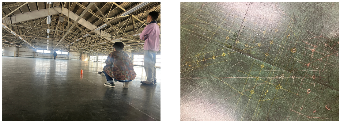 近代化産業遺産に指定されているこの場所の4階Drafting Roomの床面には船の設計図が引かれた跡が残り、かつてこの場所で行われた労働の証となっています。また、窓から見えるドックとその先に繋がる木津川、さらに向こうに阪神高速が見える風景が印象的です。この場所はどこか別の場所への繋がりを感じさせる場所です。そして会場となる3階 Free space は南北60mの奥行きと、中央に一列に並ぶ柱を持つ空間が特徴的です。ここは沢山のあそびのアイディアを浮かび上がらせてくれる場所です。