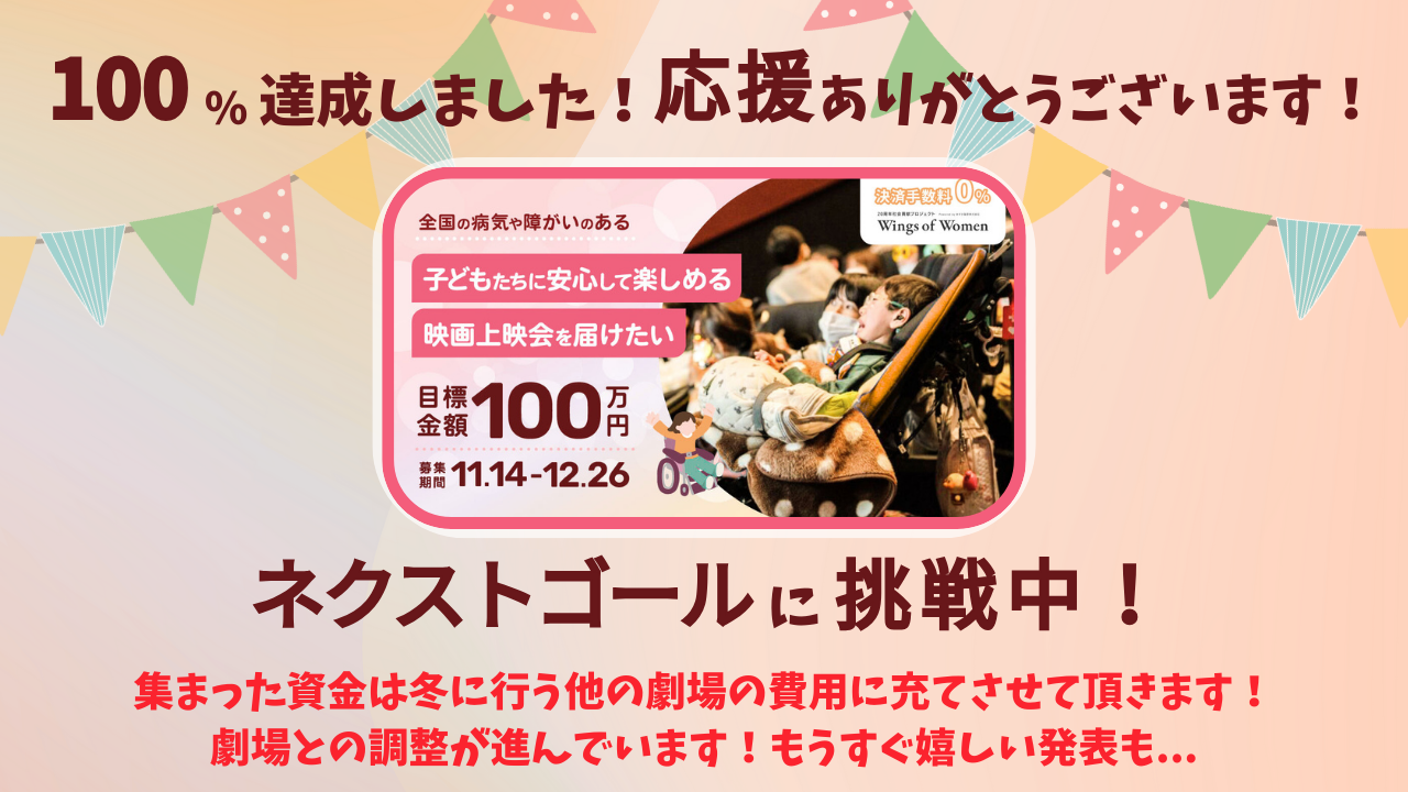 皆さまからのあたたかいご支援のおかげで、残り10日を残して100%達成となりましたことをご報告いたします! 昨日は多くの方にシェアにも協力して頂きました。本当にありがとうございます! さて、まだまだクラファン終わっておりません。 ネクストゴールは200万円! 冬に行う上映会の他の地域の費用に使わせて頂きます! 冬の上映会の概要もそろそろ発表できるのではないかと… 今スタッフが劇場とのスケジュール調整を進めているところです! 楽しみに発表をお待ちください!