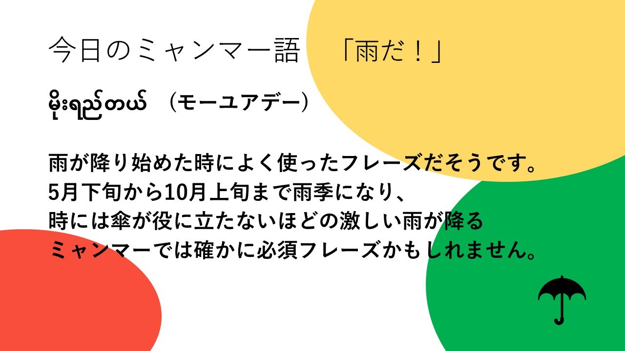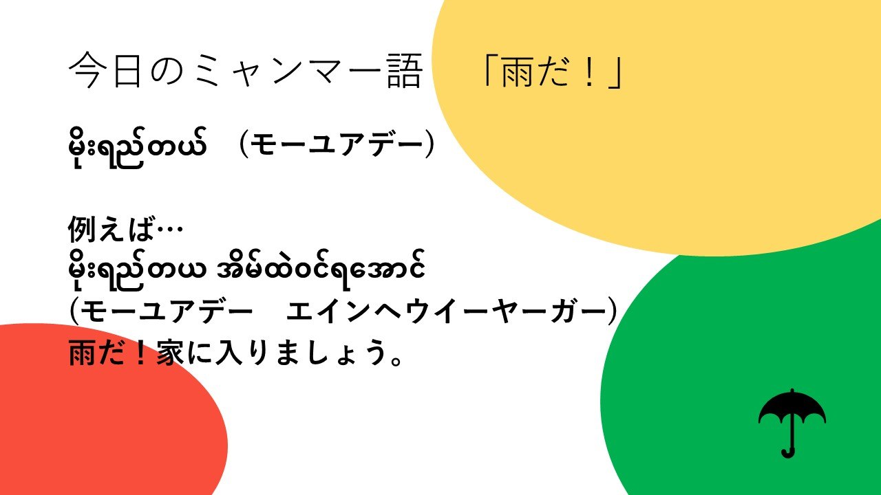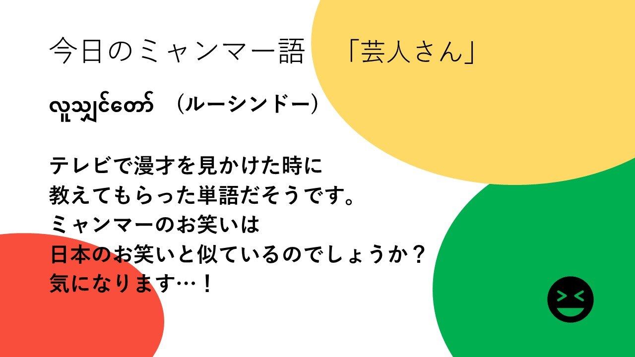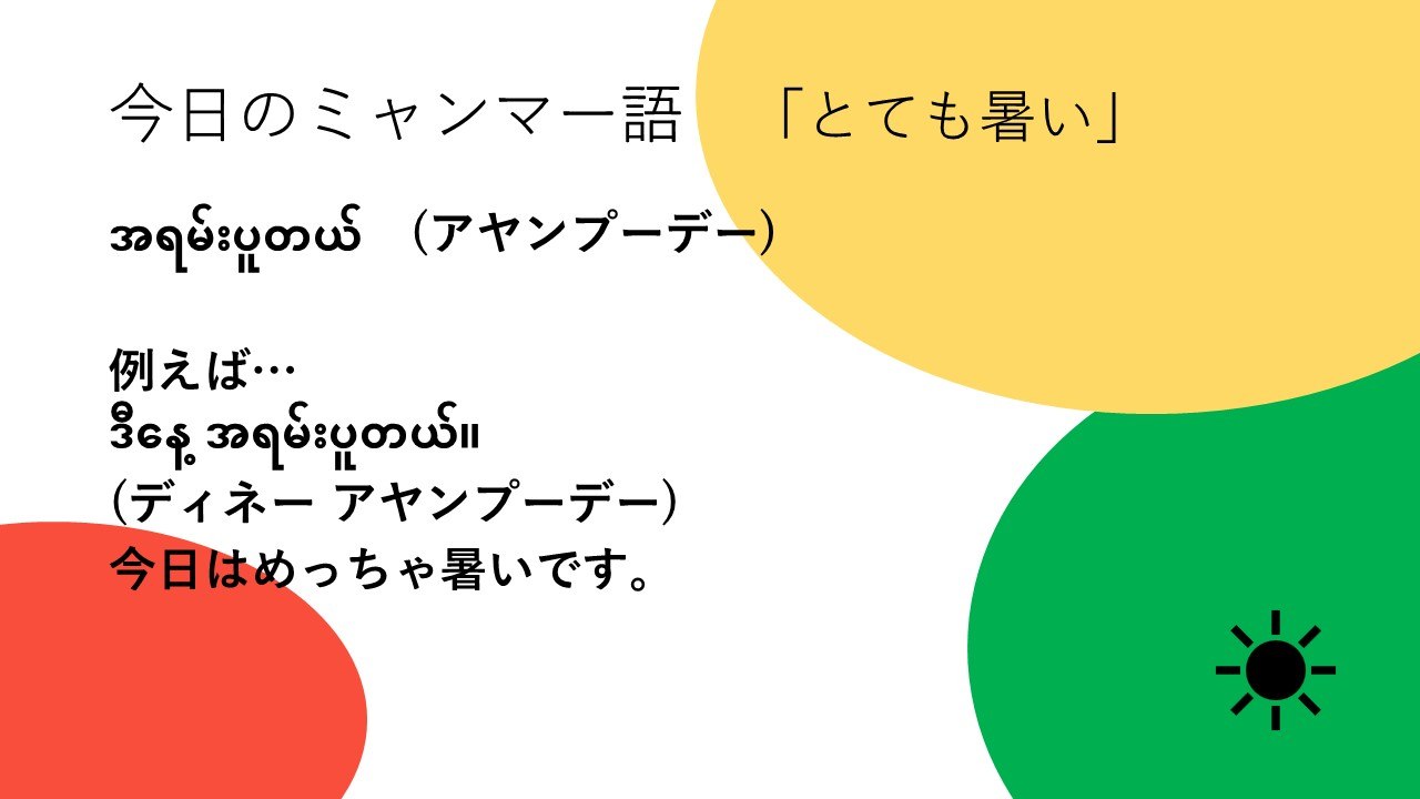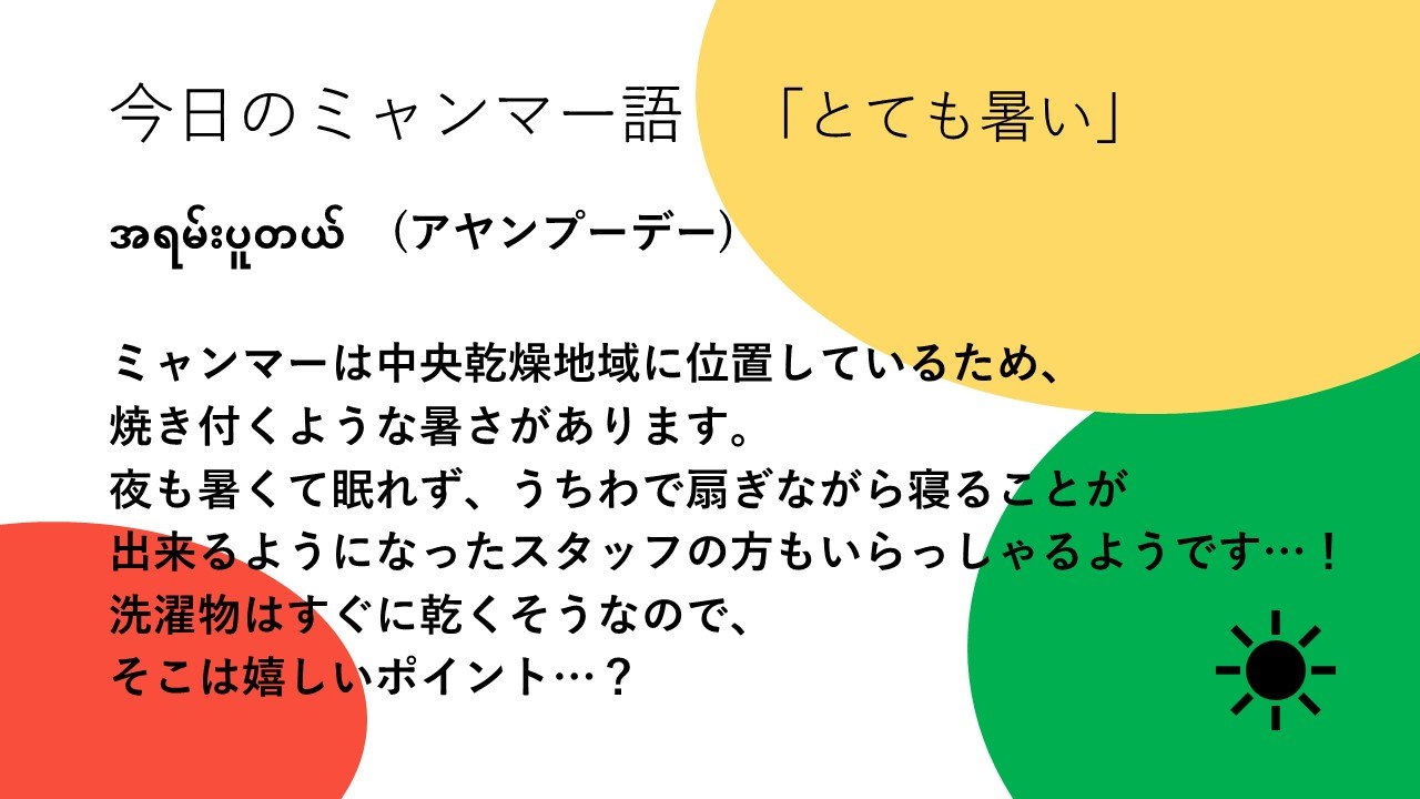 大学生インターンたちがクラファン期間中にミャンマーのアレコレについて学ぶチャレンジをします。ひとつめはミャンマー語。「きょうのミャンマー語」と題して、単語やフレーズを調べて紹介します。本日は第4回目。NGO職員として駐在したときに使えるフレーズ(?)です。