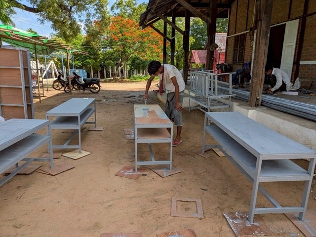 最初に訪れたのはキリスト教の教会。数人の作業員が長机を作っている。これは被災した学校へ贈る教室机とのこと。木製机が全壊したので、軽量鋼製フレームに板を張った机を制作している。この費用にはBAJが募っているミャンマー被災地支援募金も含まれている。