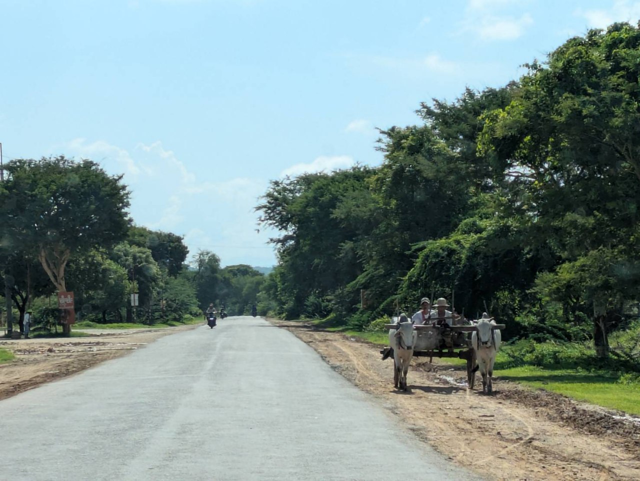 翌日、ネピドーから車で2時間ほど北上したピョウボエという町を目指す。ハイウェイを外れて旧の国道1号を走る。かろうじて車が離合できるぎりぎり2車線の舗装道路を延々と走る。車道の外にはもう1車線分の未舗装帯があるが、ここは主に牛車が通る。牛車(ぎっしゃ)といえばかぐや姫に出てくるような平安貴族が乗るアレを想像するが、ここではブルカートと呼ばれる4頭立ての埃まみれの荷車だ。前に2頭、後ろに2頭。後ろの2頭はつながれているだけなので交代要員なのだろう。正確には2頭立てである。これが何台も何台もやってくる。白いウシばかりだ。この国ではウシは貴重な輸送手段であり労働力でもある。