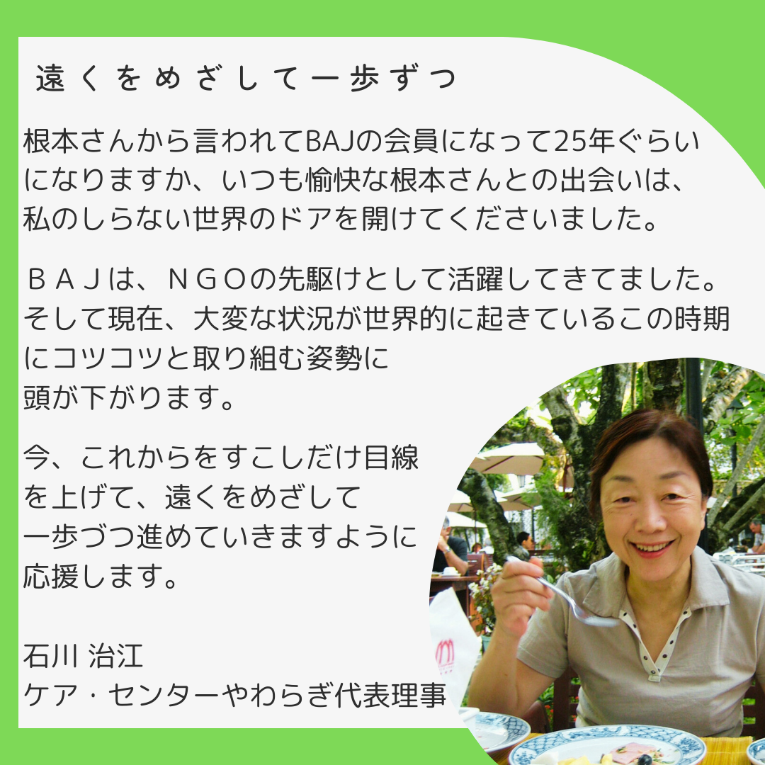石川治江さん(ケア・センターやわらぎ代表理事)からメッセージをいただきました。