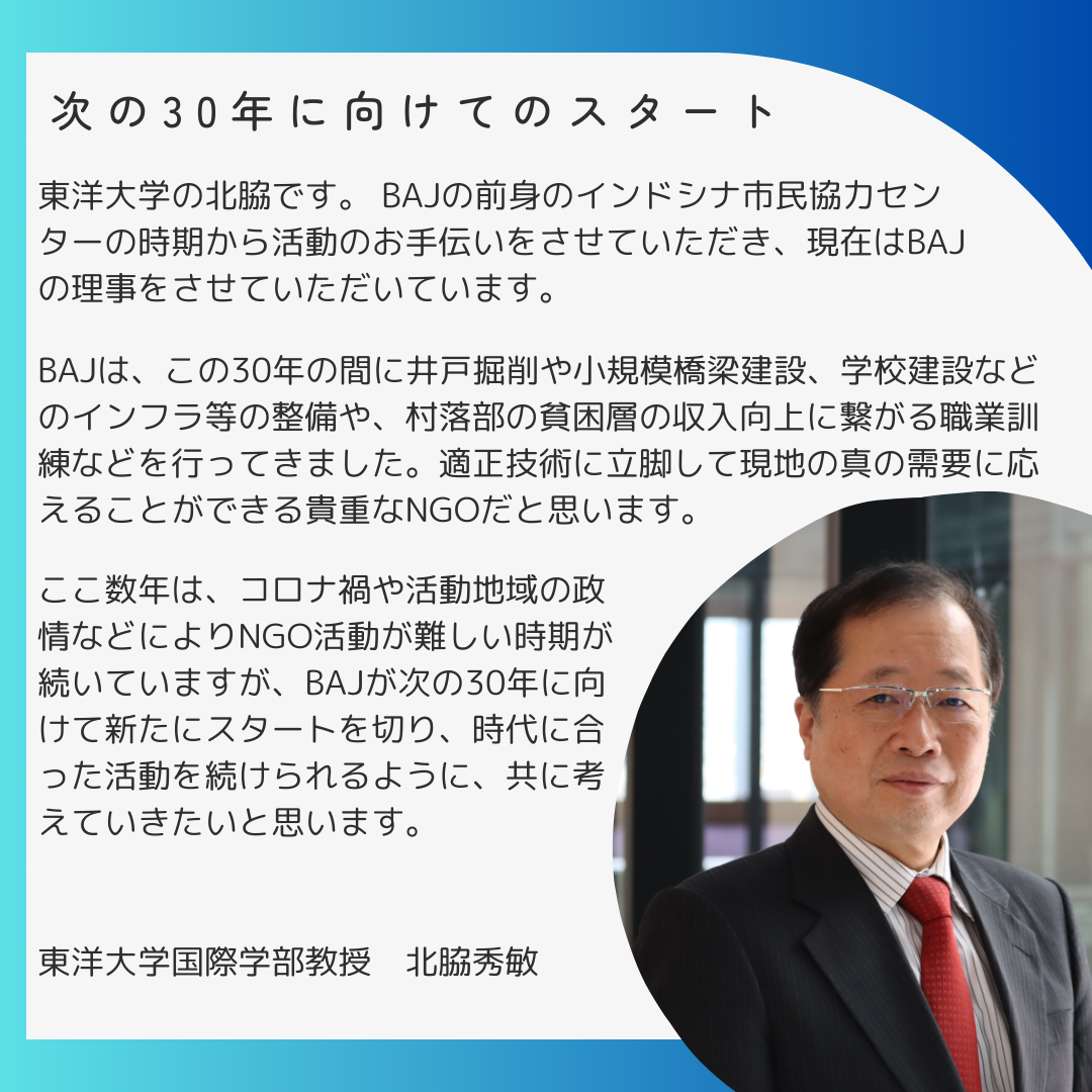 本日は 北脇秀敏さん(東洋大学国際学部教授)からメッセージをいただきました。北脇先生は、BAJ設立当初、まだ団体名がインドシナ市民協力センターだった頃から、さまざまなご協力やご助言をいただいております。長年にわたるご支援とご縁に深く感謝申し上げます。