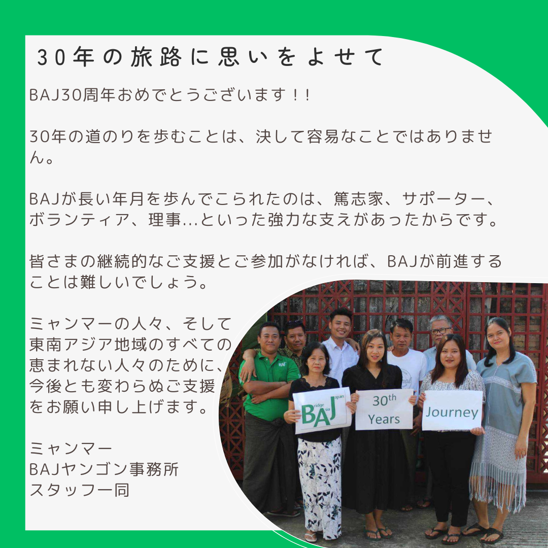 ヤンゴン事務所スタッフのメッセージからは、ミャンマーの人たちの変わらないやさしさが感じられるように思いました。30年のお祝いのことばをありがとう。これからもよろしくお願いします。