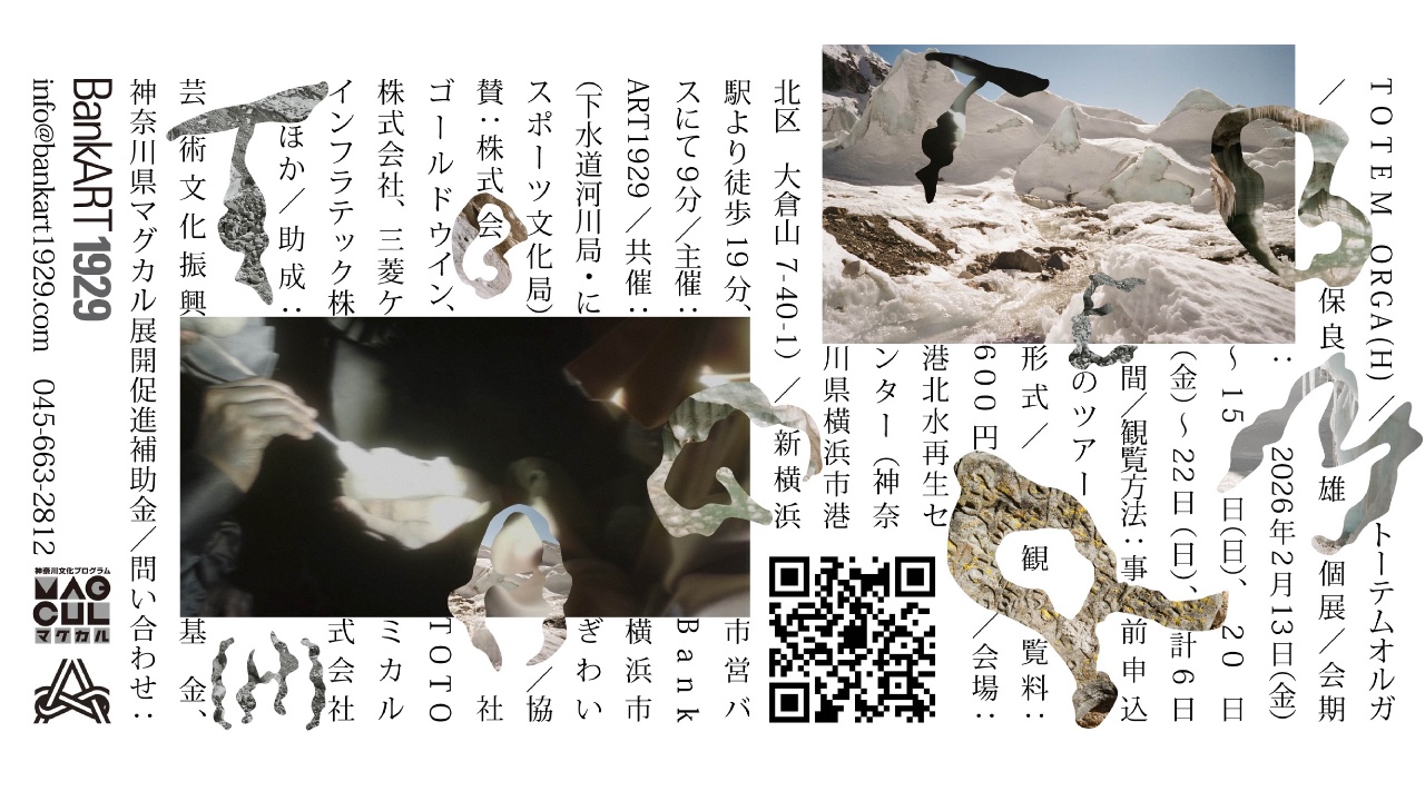 2026-01-19 20:02保良 雄 個展「TOTEM ORGA(H)/トーテムオルガ」 開催のお知らせBankART1929ではこの度、拠点に依らない活動へと舵を切るなか、その新たな姿勢を示す自主事業の第一弾として、稼働中の下水処理施設「港北水再生センター」を会場に、保良雄 個展「TOTEM ORGA(H) /トーテムオルガ」を開催する運びになりました。 詳細はこちら→2026-01-19 20:02保良 雄 個展「TOTEM ORGA(H)/トーテムオルガ」 開催のお知らせBankART1929ではこの度、拠点に依らない活動へと舵を切るなか、その新たな姿勢を示す自主事業の第一弾として、稼働中の下水処理施設「港北水再生センター」を会場に、保良雄 個展「TOTEM ORGA(H) /トーテムオルガ」を開催する運びになりました。 詳細はこちら→