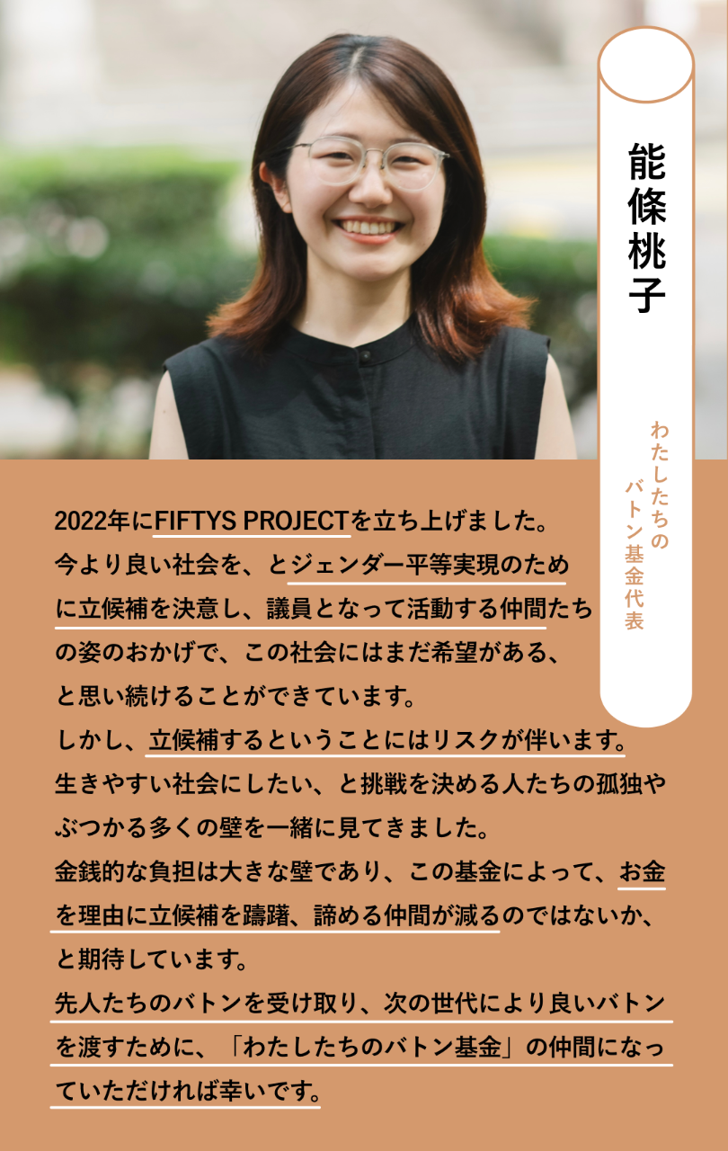 「わたしたちのバトン基金」の支援を受け当選した議員が、次に挑戦する未来の候補者たちに繋いでいく、そんな循環が生まれることを目指しています。
