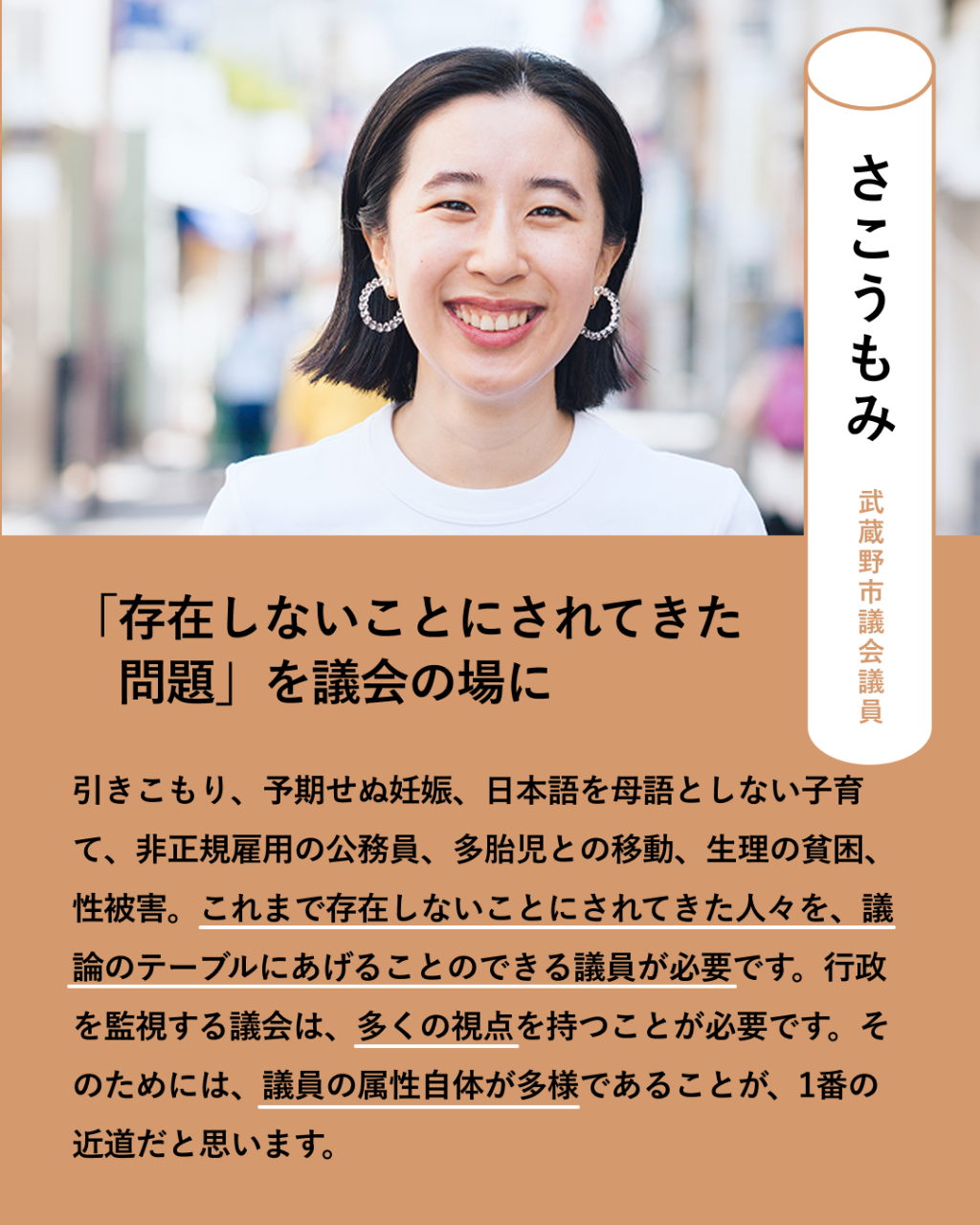 2022年夏、「政治分野のジェンダー不平等、わたしたちの世代で解消を」と掲げ、地方議会に立候補する20代・30代の女性(シス/トランス)、ノンバイナリー、Xジェンダーの支援を行うFIFTYS PROJECTを立ち上げ、これまで36名の候補者を支援してきました。