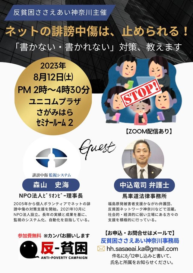 実はもう一つ講演会を「反貧困ささえあい神奈川」主催でやります。 こちらも開催まで1ヶ月切っているので、シェア・拡散のご協力お願いします。 ネットの誹謗中傷をどうやって止めるのか? 図らずもタイムリーなテーマになってしまったのかも知れない。 遠くの雲の上の出来事ではなく、すぐ隣りで起きている事。 行政の方、自治体議員の方々にも参加を呼びかけます。