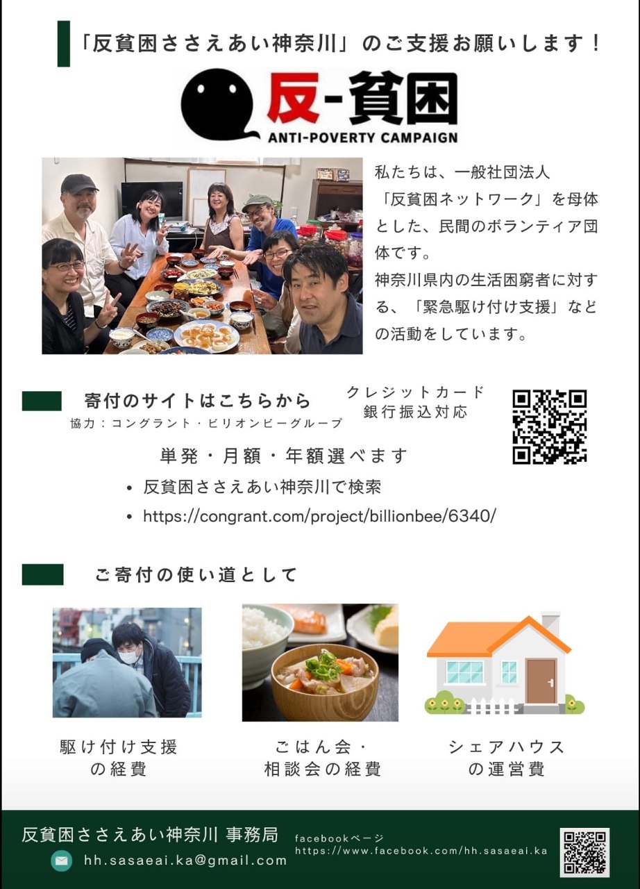 神奈川県内で生活困窮で苦しむ人たちが、少しでも安心・安全な生活ができ、自立と自律に向けての一歩が踏み出せるよう、活動しています。