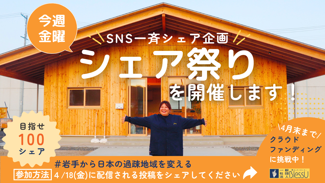 2025-04-16 08:00【4/18(金)開催】SNSシェアが応援になる!"シェア祭り"開催のお知らせ今週金曜、4月18日に、クラウドファンディングをSNSシェアで応援する企画《シェア祭り》を開催します! 皆さまには当日ブレスユーがSNSで発信する投稿のシェアをお願いします!詳しい方法や企画の意図については詳細をご確認ください◎2025-04-16 08:00【4/18(金)開催】SNSシェアが応援になる!"シェア祭り"開催のお知らせ今週金曜、4月18日に、クラウドファンディングをSNSシェアで応援する企画《シェア祭り》を開催します! 皆さまには当日ブレスユーがSNSで発信する投稿のシェアをお願いします!詳しい方法や企画の意図については詳細をご確認ください◎