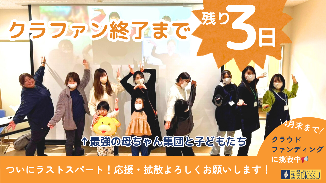 2025-04-28 10:00【残り2日!】未来を一緒に拓くラストスパート、共に走りきりましょう!みなさま、これまでの温かい応援、本当にありがとうございます。 一般社団法人BlessUが挑戦してきたクラウドファンディングも、いよいよ残り2日となりました。 このプロジェクトは、単なる資金集めではありません。 「地域で誰も取り残さない未来」を、みなさんと共に形にする挑戦です。 ここまで歩んできた道のりは、皆さん一人ひとりの想いと行動の積み重ねによって支えられてきました。 本当に、心から感謝しています。2025-04-28 10:00【残り2日!】未来を一緒に拓くラストスパート、共に走りきりましょう!みなさま、これまでの温かい応援、本当にありがとうございます。 一般社団法人BlessUが挑戦してきたクラウドファンディングも、いよいよ残り2日となりました。 このプロジェクトは、単なる資金集めではありません。 「地域で誰も取り残さない未来」を、みなさんと共に形にする挑戦です。 ここまで歩んできた道のりは、皆さん一人ひとりの想いと行動の積み重ねによって支えられてきました。 本当に、心から感謝しています。