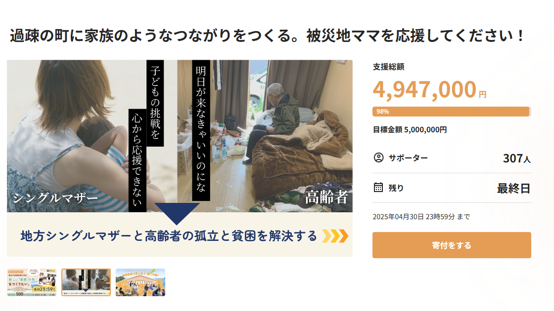 2025-04-29 09:00【ラスト1日】ここまでの軌跡、そして未来へ — BlessUの挑戦「私たちがこのプロジェクトを立ち上げたのは、単なる施設を作りたかったからではありません。」 それは、人が人らしく生きられる場所を、この地域に取り戻したかったからでした。 岩手県山田町。 震災と人口減少の波に押され、 少しずつ、けれど確実に、笑顔もつながりも減っていくなかで、 私たちは何度も悔しい思いをしてきました。 孤立するシングルマザー。 支援を求められない高齢者。 「助けて」と言えないまま、誰にも知られず困っている人たち。 そんな現実を変えたい。 それが、BlessUの原点でした。2025-04-29 09:00【ラスト1日】ここまでの軌跡、そして未来へ — BlessUの挑戦「私たちがこのプロジェクトを立ち上げたのは、単なる施設を作りたかったからではありません。」 それは、人が人らしく生きられる場所を、この地域に取り戻したかったからでした。 岩手県山田町。 震災と人口減少の波に押され、 少しずつ、けれど確実に、笑顔もつながりも減っていくなかで、 私たちは何度も悔しい思いをしてきました。 孤立するシングルマザー。 支援を求められない高齢者。 「助けて」と言えないまま、誰にも知られず困っている人たち。 そんな現実を変えたい。 それが、BlessUの原点でした。
