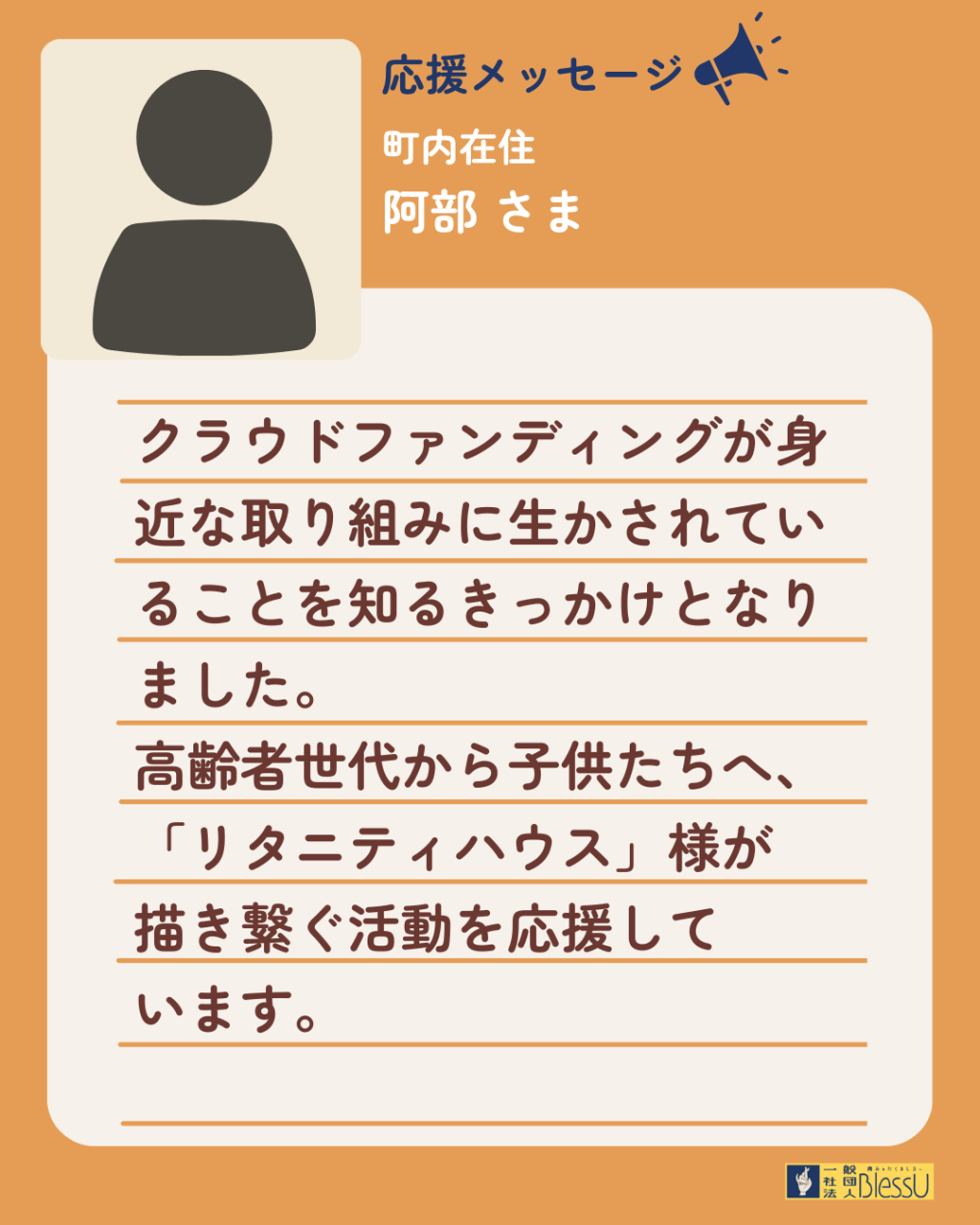 阿部さまは日頃から私たちの活動を見守って応援してくださっている支援者の方の一人です。