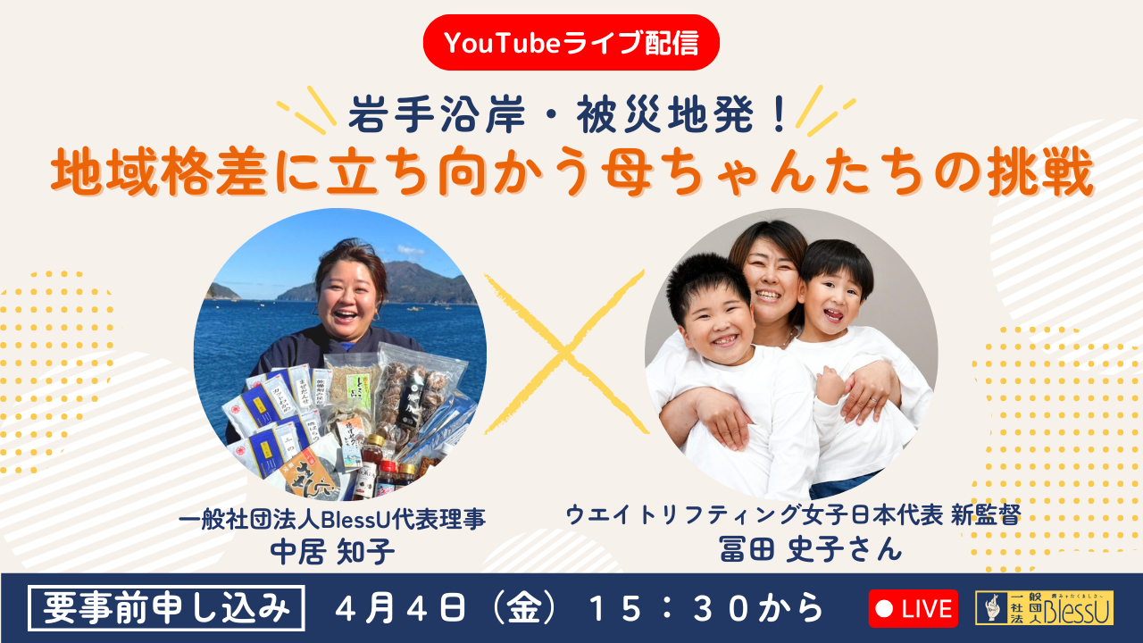 ただいま挑戦中のクラウドファンディングについて、アンバサダーの冨田史子さんをお迎えしての対談ライブ開催が決定しました!タイトルは、【岩手沿岸・被災地発!地域格差に立ち向かう母ちゃんたちの挑戦】 4月4日(金)15:30から開催予定です。