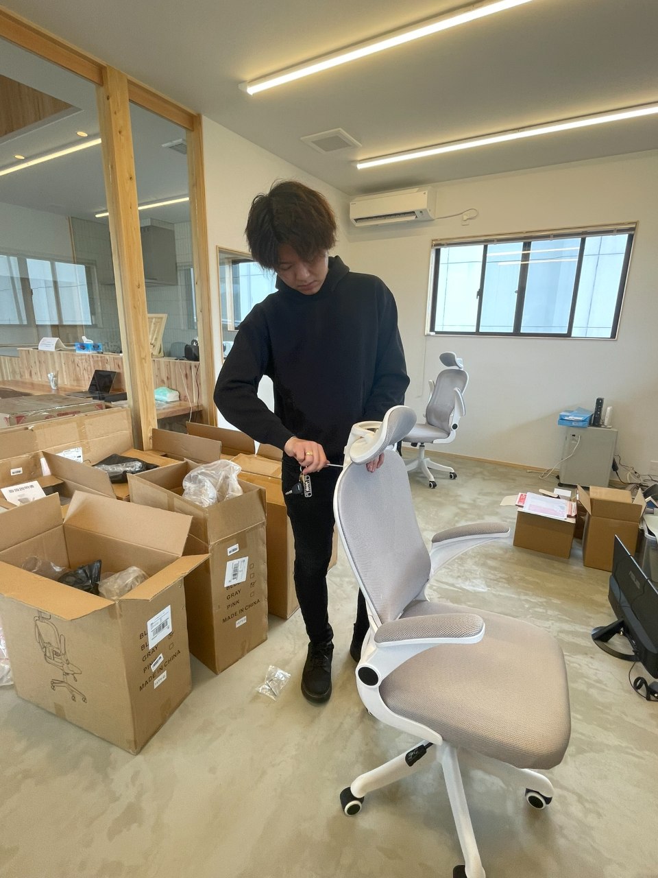 ▲学び働くためのPCとモニターが不足し、デスクは会議用テーブルを使用中