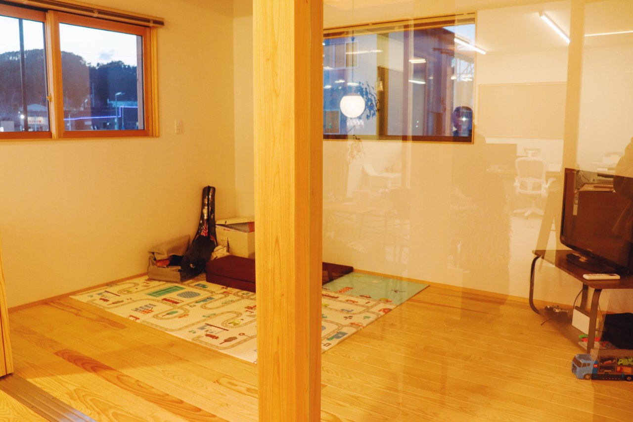オフィス、キッチンカウンター、ダイニングテーブル、キッズルーム。