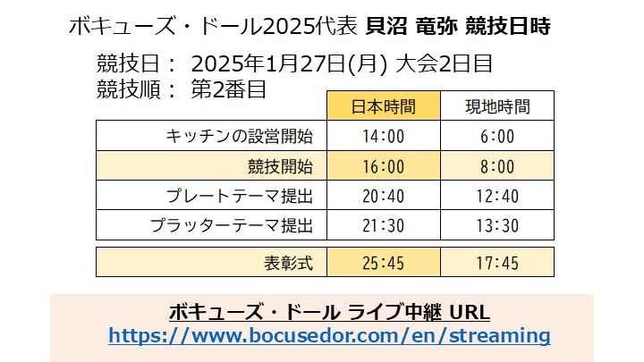 2025-01-24 18:48貝沼シェフの競技順とウェブ配信URLいよいよ、ボキューズ・ドール2025フランス本選開始まであと2日となりました。 リヨン近郊のオーベルジュを借りて行われている合宿も佳境です。睡眠時間もない中、貝沼シェフをはじめとする合宿に参加しているみんなが一丸となって頑張っています。 貝沼シェフの大会競技順は、第2日目(27日(月))の第2番目となっています。 日本時間の16時に協議開始します。最初の料理の提出が20:40。最後の料理の提出が21:30となります。 貝沼シェフの競技はウェブのリアル配信で視聴可能です。 熱いシェフの戦いを是非ご覧下さい! 【配信URL】 https://www.bocusedor.com/en/streaming2025-01-24 18:48貝沼シェフの競技順とウェブ配信URLいよいよ、ボキューズ・ドール2025フランス本選開始まであと2日となりました。 リヨン近郊のオーベルジュを借りて行われている合宿も佳境です。睡眠時間もない中、貝沼シェフをはじめとする合宿に参加しているみんなが一丸となって頑張っています。 貝沼シェフの大会競技順は、第2日目(27日(月))の第2番目となっています。 日本時間の16時に協議開始します。最初の料理の提出が20:40。最後の料理の提出が21:30となります。 貝沼シェフの競技はウェブのリアル配信で視聴可能です。 熱いシェフの戦いを是非ご覧下さい! 【配信URL】 https://www.bocusedor.com/en/streaming