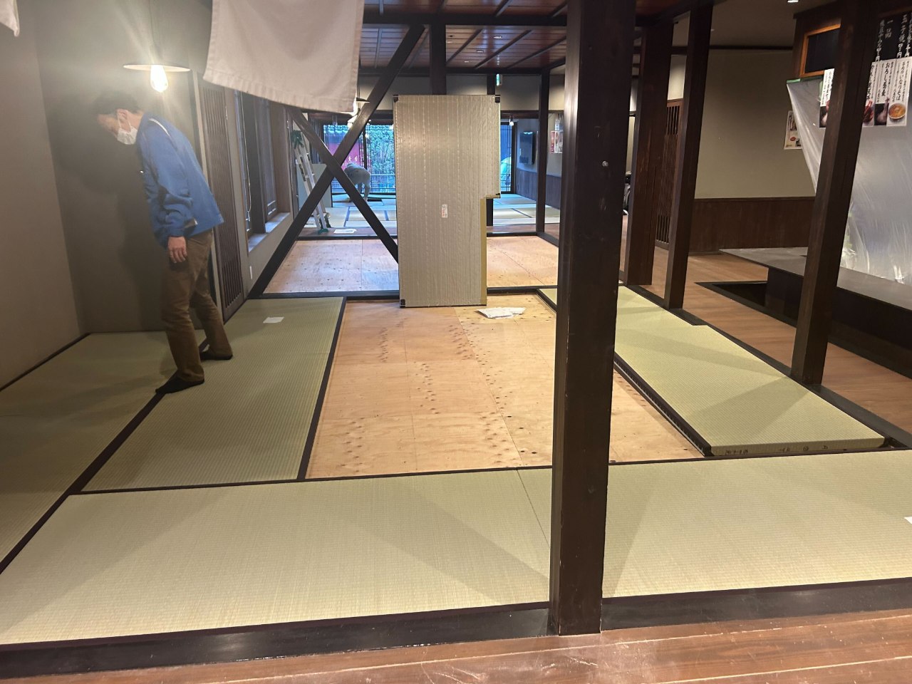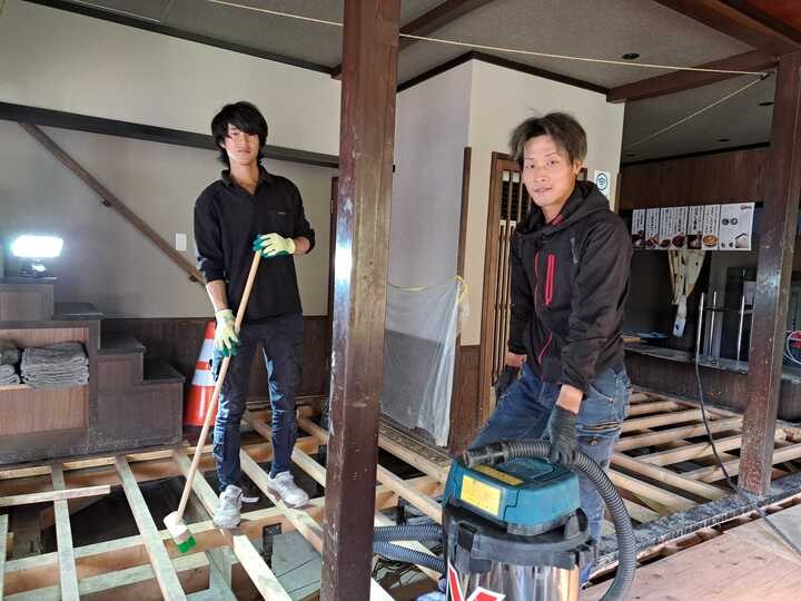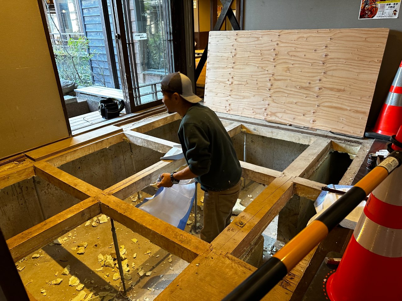 10/26からの部分営業中は飲食や休憩には2Fをご利用いただき、1Fの畳の張替えに向けて作業を進めました。11月11日よりベニヤ板の張替えがスタート!