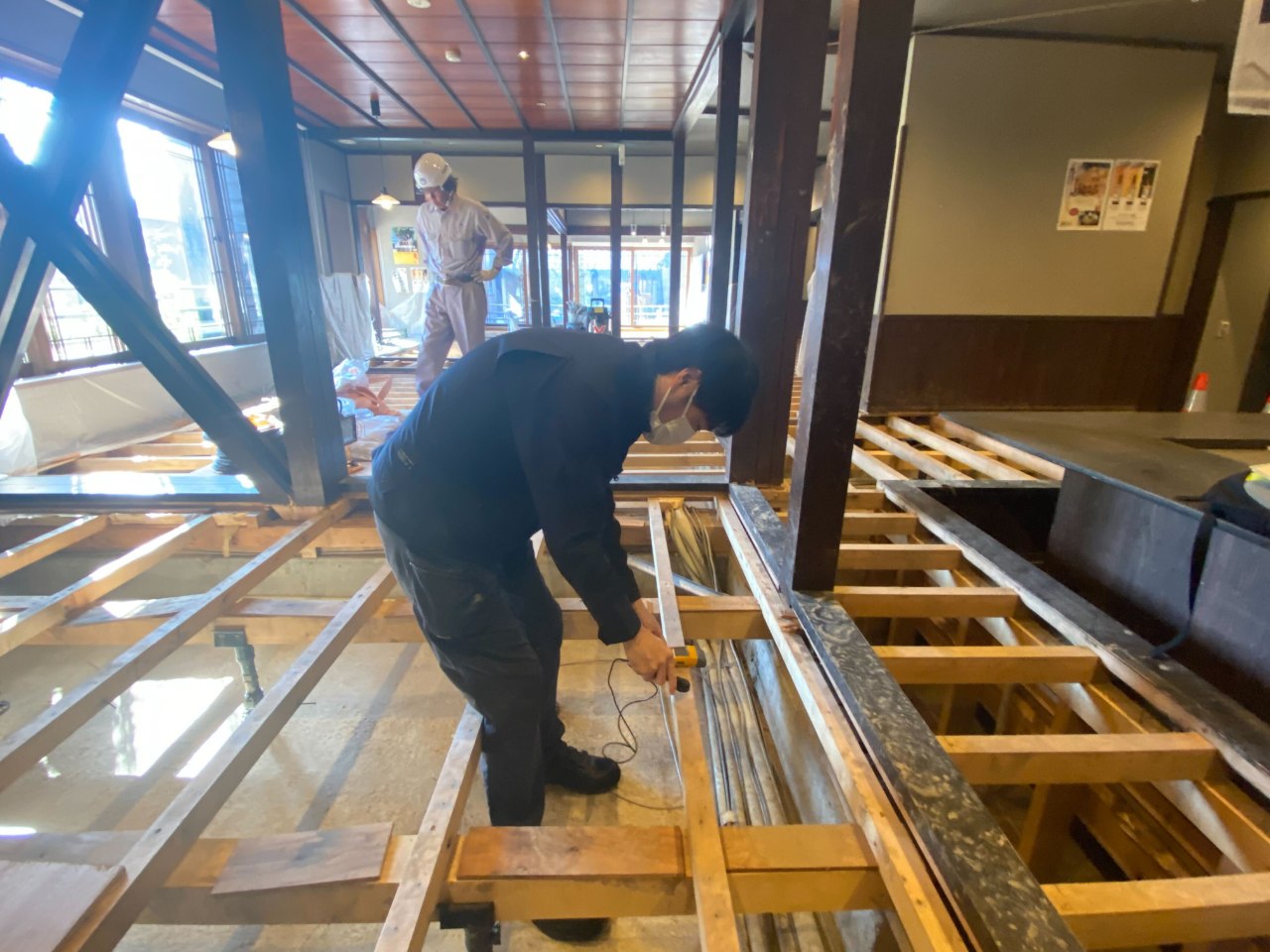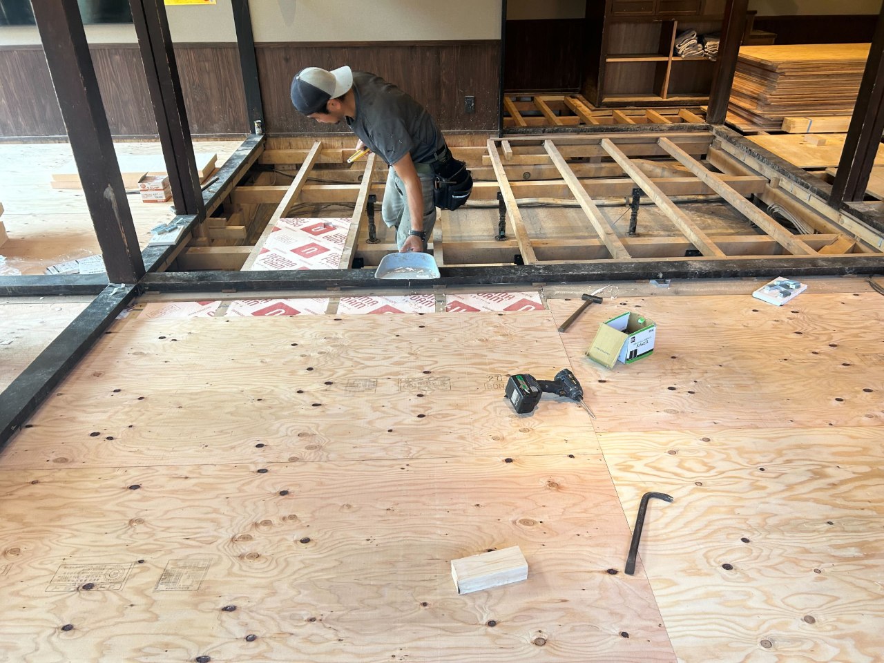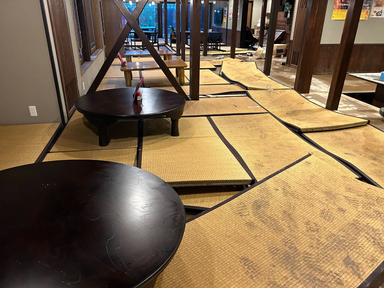 10/26からの部分営業中は飲食や休憩には2Fをご利用いただき、1Fの畳の張替えに向けて作業を進めました。11月11日よりベニヤ板の張替えがスタート!