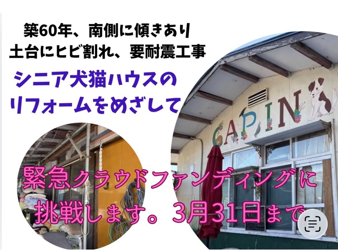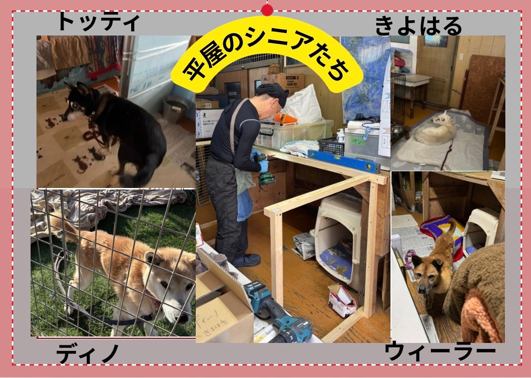 各ハウスに暮らす保護犬たちが年をとればみな平屋に移動し、やはり年を重ねたボランティアさんたちが面倒をみていくことになります。シニアとなる犬たちに優しい、人にも優しい平屋シェルターの耐震工事に、どうかご協力を、よろしくお願いいたします。