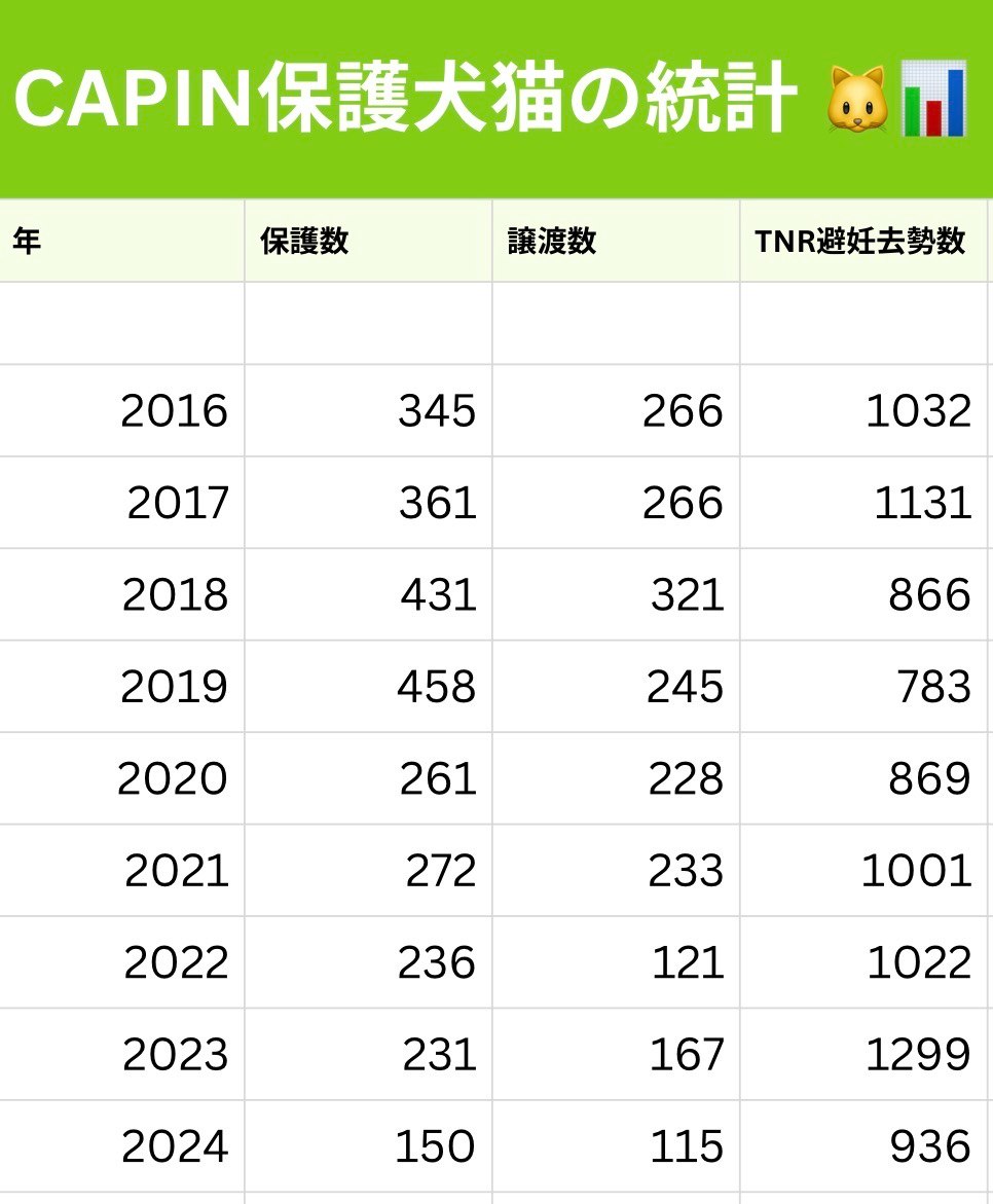 ここ9年のCAPINの活動内容(保護数、譲渡数、避妊去勢数)をまとめたのが上表となります。