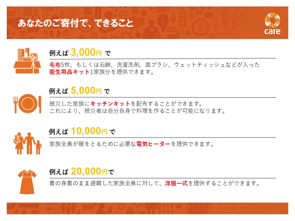 あなたのあと一押しのご寄付で、以下のような支援を被災者の皆さまへ届けることができます。ぜひ、最後の一押しを、何卒よろしくお願いいたします!