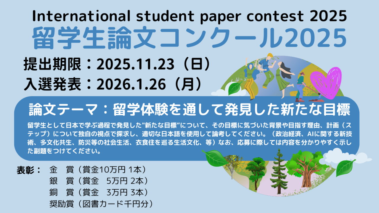 当法人は、留学生の皆様に日本語による論文作成の機会を提供し、日本留学の成果を広く社会に発信することで、国際相互理解と国際交流の促進に貢献することを目的とした「留学生論文コンクール」を実施しております。