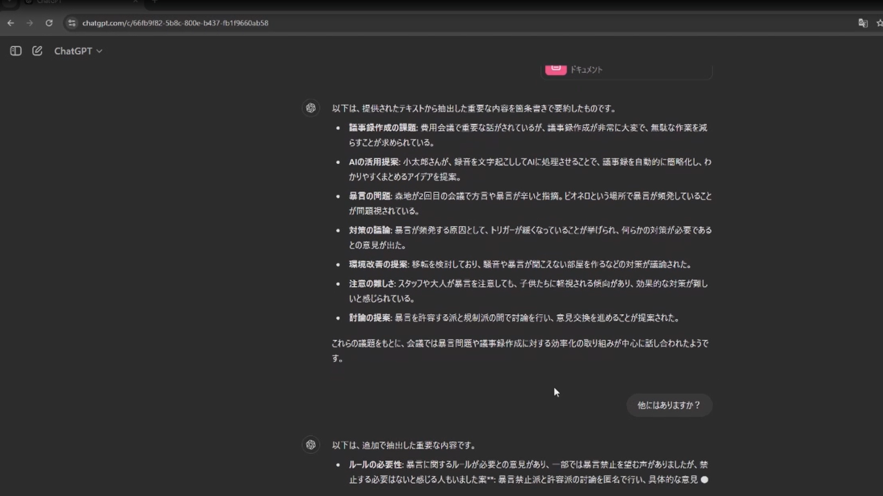 2024-10-16 11:46子どもがAIを使って議事録を作成してみた!一般社団法人ぴおねろの森・代表の大河原です。 寄付募集が始まり2週間が経ちました。 ここまで14名・企業の方から1,381,000円ご寄付いただいております。 多くのご支援に心より感謝申し上げます。 今日は、ぴおねろの森での子どもたちの活動を紹介します!2024-10-16 11:46子どもがAIを使って議事録を作成してみた!一般社団法人ぴおねろの森・代表の大河原です。 寄付募集が始まり2週間が経ちました。 ここまで14名・企業の方から1,381,000円ご寄付いただいております。 多くのご支援に心より感謝申し上げます。 今日は、ぴおねろの森での子どもたちの活動を紹介します!