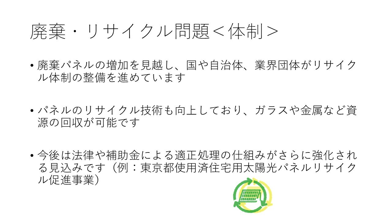 太陽光パネルのリサイクルについては、義務化が検討されながらまだ実現されていません。