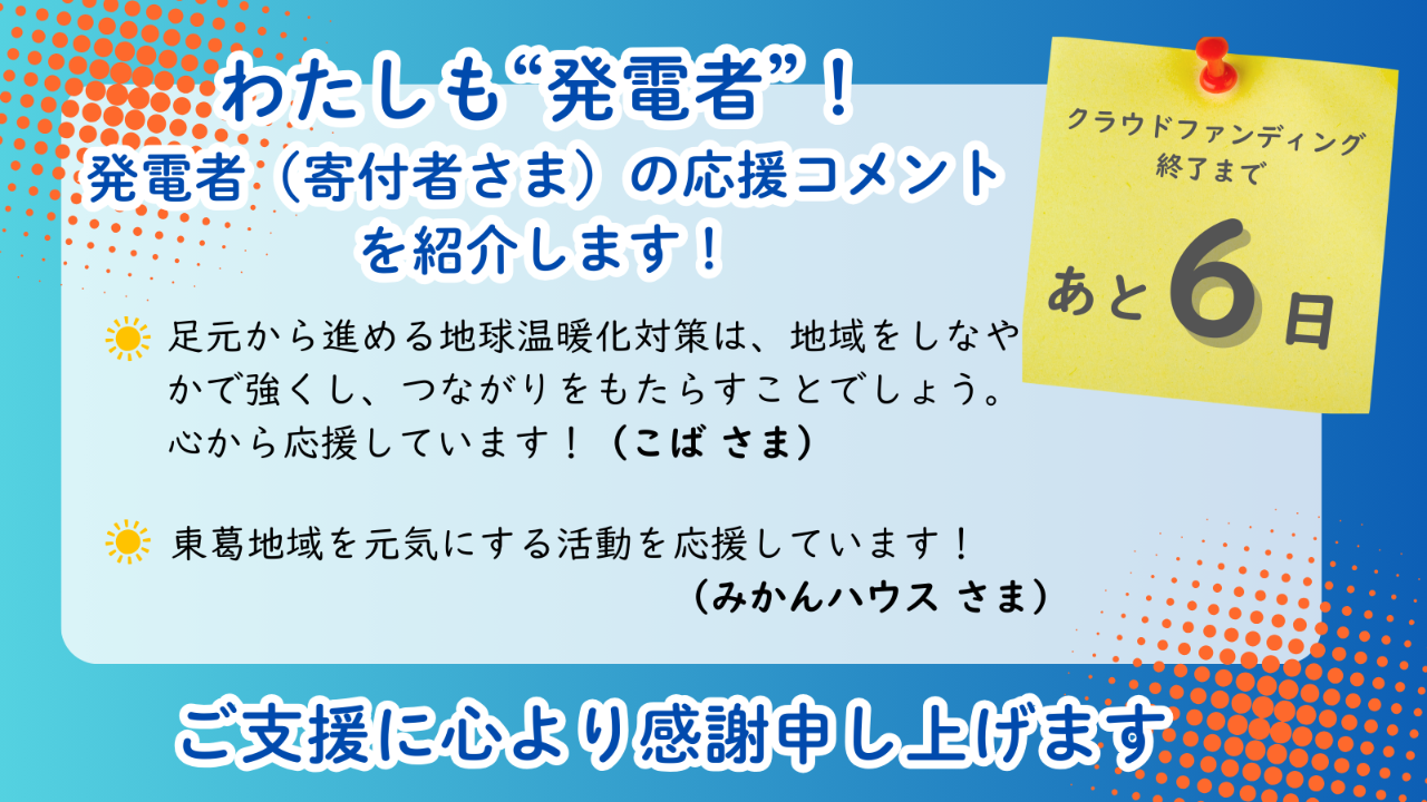 「足元から」「地域を強く」「つながり」と柏そらぴか発電所第3号のコンセプトをしっかり押さえていただいたコメント、嬉しく思います。「国が2030年までに温室効果ガスの46%削減を宣言」といった文言は、方向性を示すものとして大切ですが、同時に雲をつかむような感もあります。実際46%を構成するのは、アチコチでの政府、自治体、企業、そして我々のような市民の温室効果ガス削減の取組みです。