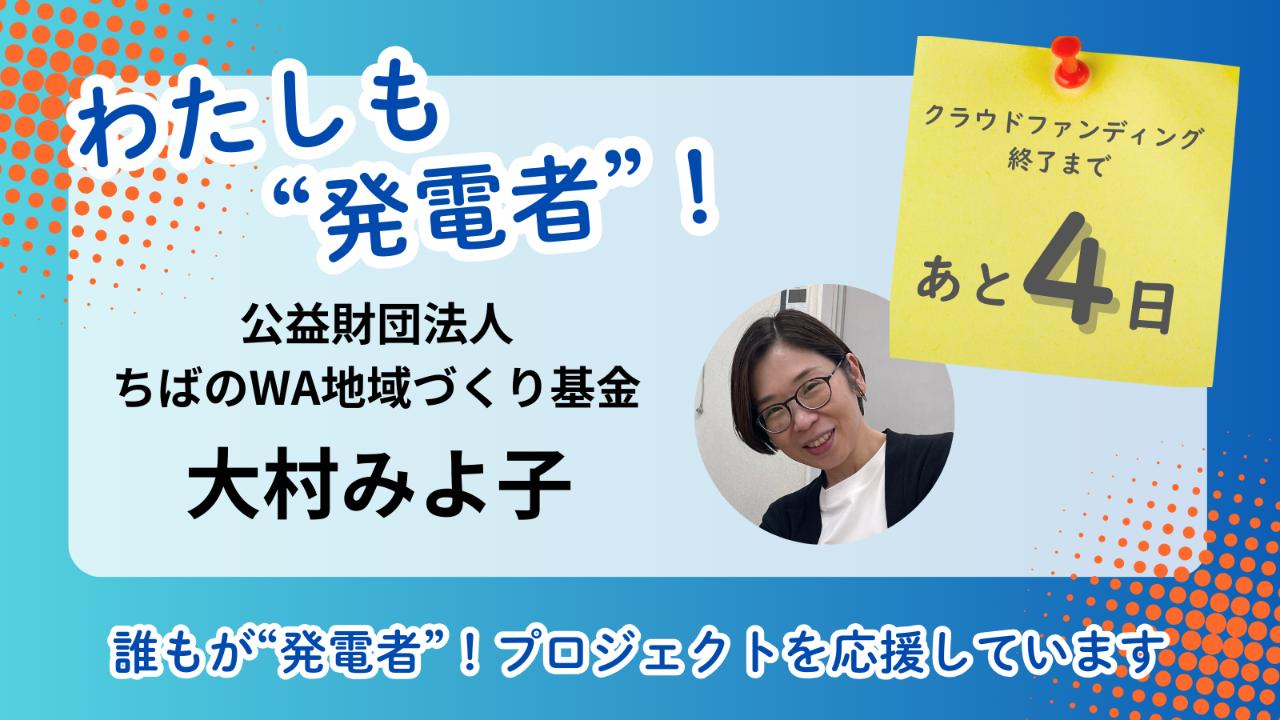 一般社団法人銀座環境会議さんとともに寄付募集プロジェクトに挑戦している、公益財団法人ちばのWA地域づくり基金の大村みよ子です。 当財団が運営する「事業指定助成プログラム2025」の選考を経て実施に至った「誰もが“発電者”!」プロジェクトは、現在のご寄付額は858,000円、発電者(寄付者さま)は95人となりました。