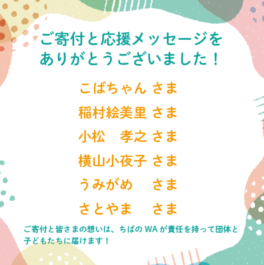2024-11-27 18:23寄付者の皆さま、ぜひご参加ください!2023年度成果報告会を開催いたします☆公益財団法人ちばのWA地域づくり基金より、2023年2月~3月のクラウドファンディング「【体験」や「学び」を提供し、経済的困難を抱える家庭の子どもたちの未来を支えたい】にご寄付いただきました皆さまへのご案内です。 ご寄付を原資に実施した助成プログラム「子どもの今と未来を支える基金2023年度助成」の採択団体が、寄付者の皆さまに向けて事業をご報告いたします。 年末のお忙しい時期とは存じますが、ぜひご参加ください。2024-11-27 18:23寄付者の皆さま、ぜひご参加ください!2023年度成果報告会を開催いたします☆公益財団法人ちばのWA地域づくり基金より、2023年2月~3月のクラウドファンディング「【体験」や「学び」を提供し、経済的困難を抱える家庭の子どもたちの未来を支えたい】にご寄付いただきました皆さまへのご案内です。 ご寄付を原資に実施した助成プログラム「子どもの今と未来を支える基金2023年度助成」の採択団体が、寄付者の皆さまに向けて事業をご報告いたします。 年末のお忙しい時期とは存じますが、ぜひご参加ください。