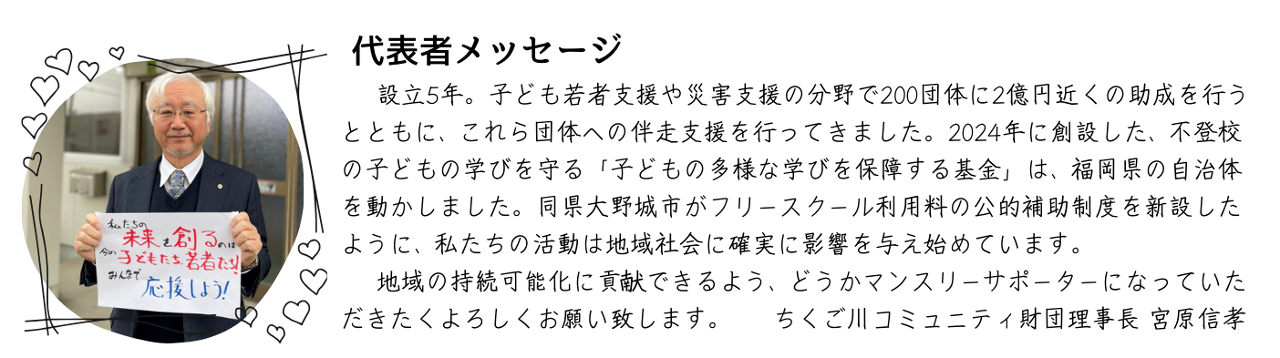 ちくご川コミュニティ財団は、筑後川関係地域で多様な学びの場を保障することを目指して基金を立ち上げました。この基金で、フリースクール等利用者の子どもを対象とした給付型奨学金事業を運営します。