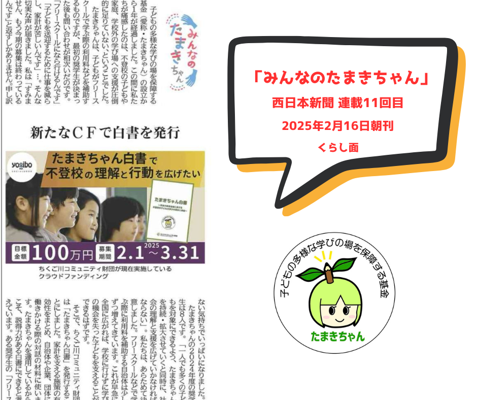 私たちは、基金協働パートナーの西日本新聞社様、200名の寄付者様と一緒に、不登校の子どもの学びを応援する「子どもの多様な学びの場を保障する基金」(愛称・たまきちゃん)を2024年2月1日に設立しました。