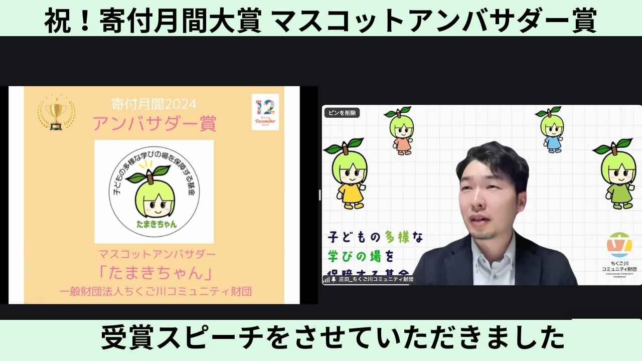 25日夜、寄付月間共同事務局主催のオンラインイベントで受賞スピーチをさせていただきました。そして、たまきちゃんの全身イラストも披露されました!
