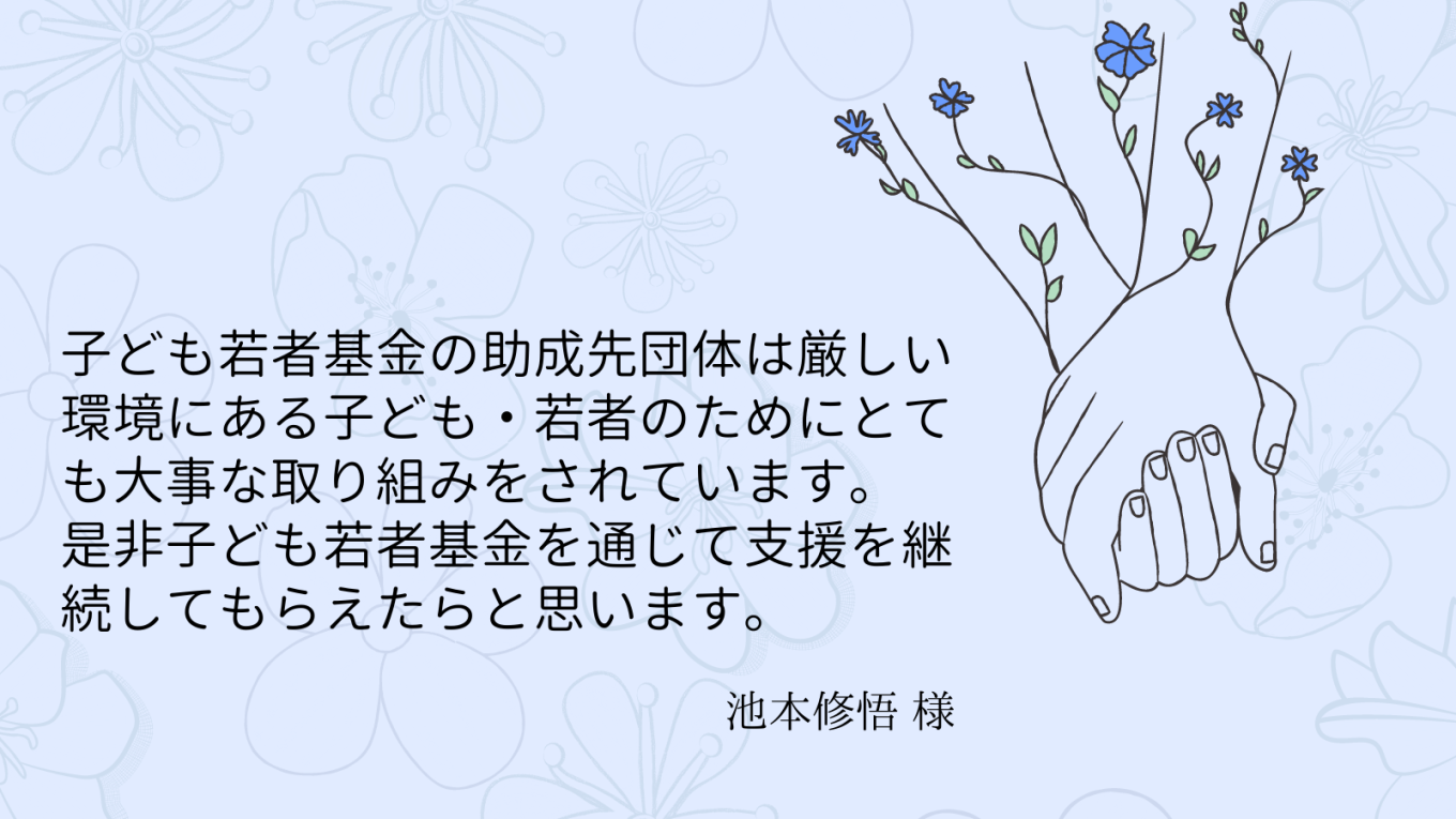 2023-01-27 16:33応援メッセージのご紹介子ども若者基金の存続を願って、あたたかいメッセージが寄せられています2023-01-27 16:33応援メッセージのご紹介子ども若者基金の存続を願って、あたたかいメッセージが寄せられています