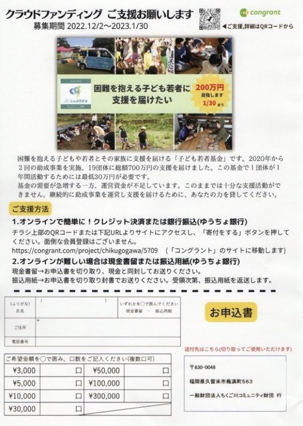 2024-05-01 17:45ちくご川コミュニティ財団5周年を迎えます困難を抱える子ども若者とその家族に支援を届ける「子ども若者基金」を応援いただきありがとうございます。 クラウドファンディングのご支援をいただいて運営した「第3回子ども若者応援助成事業」は、今年3月に6つの助成団体の事業が無事終了しました。各団体の活動報告は改めてお知らせいたします。 8月1日、おかげさまでちくご川コミュニティ財団は設立5周年を迎えます。 子ども若者基金を通して、必要な方に必要な支援が届くように。これからも応援よろしくお願いいたします。2024-05-01 17:45ちくご川コミュニティ財団5周年を迎えます困難を抱える子ども若者とその家族に支援を届ける「子ども若者基金」を応援いただきありがとうございます。 クラウドファンディングのご支援をいただいて運営した「第3回子ども若者応援助成事業」は、今年3月に6つの助成団体の事業が無事終了しました。各団体の活動報告は改めてお知らせいたします。 8月1日、おかげさまでちくご川コミュニティ財団は設立5周年を迎えます。 子ども若者基金を通して、必要な方に必要な支援が届くように。これからも応援よろしくお願いいたします。