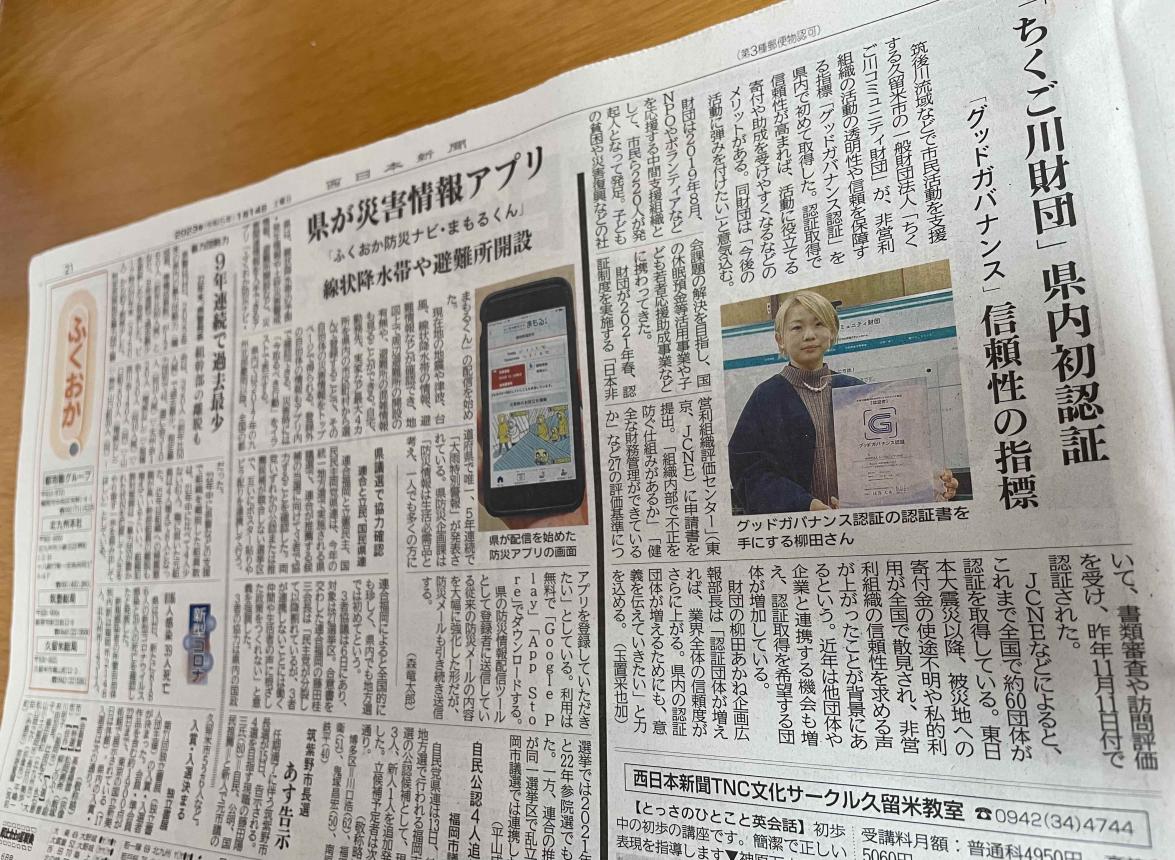 さて、ちくご川コミュニティ財団が昨年11月に「グッドガバナンス認証」を福岡県内で初めて取得したことが、1月14日付西日本新聞の朝刊で取り上げられました。取材、掲載をいただき誠にありがとうございます。