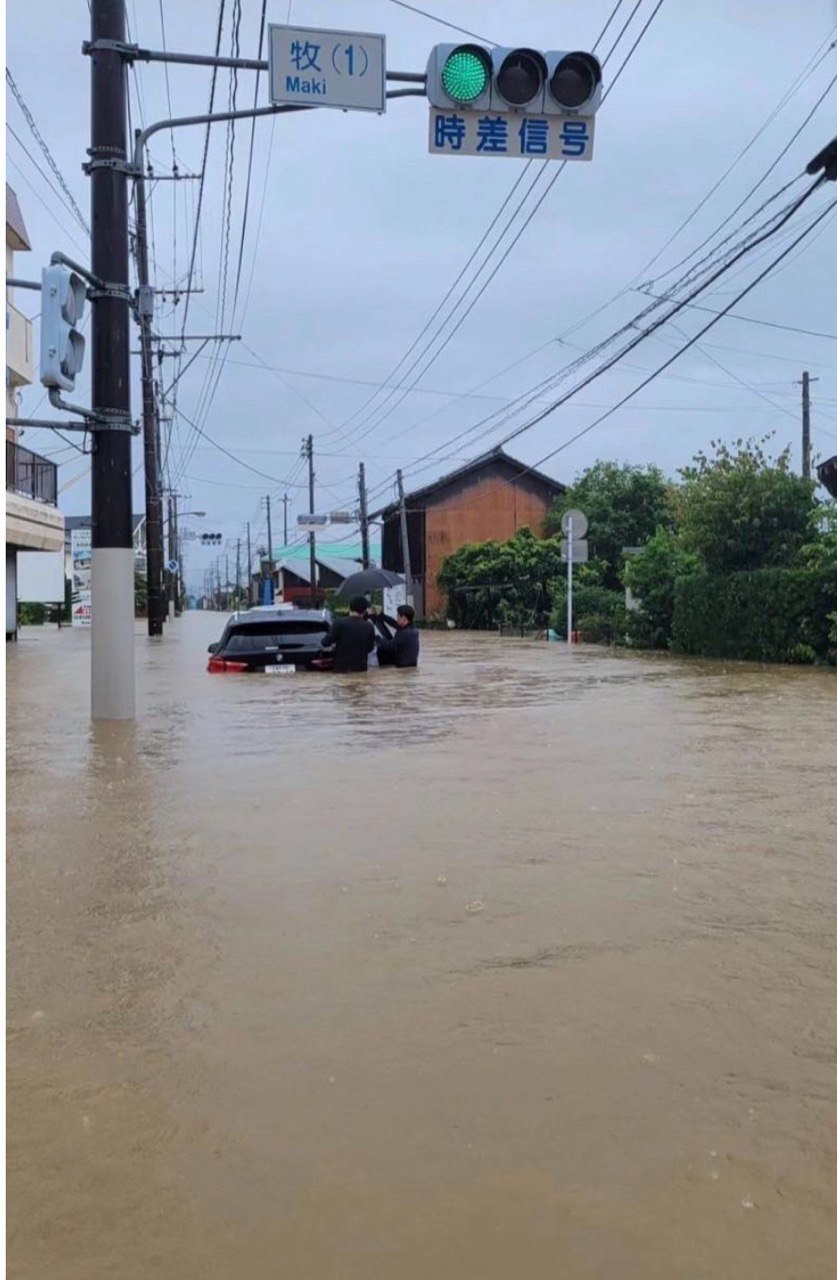▲大人の腰の高さまで冠水した久留米市田主丸町牧の交差点(出所:久留米市防災チャットボット)