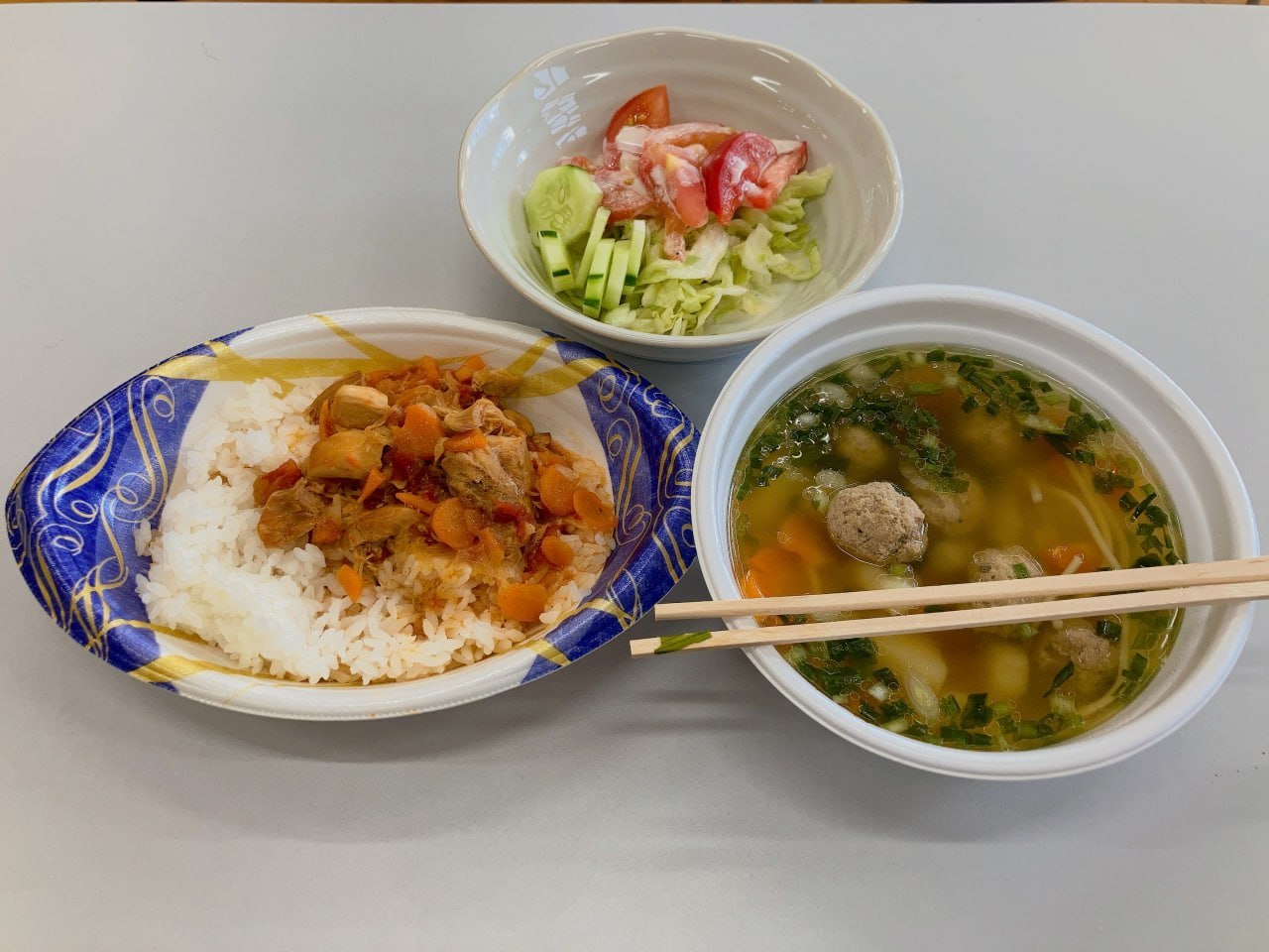 作ったのは、ミートボールスープ、チキンライス、サラダの3品。2日間煮込んで野菜のうまみが溶け出したスープに、最後の仕上げで子どもたちが折ったパスタを鍋へ投入。サラダはアンナさんが手を添えながら、上手に包丁でキャベツやキュウリを刻んでいきました。