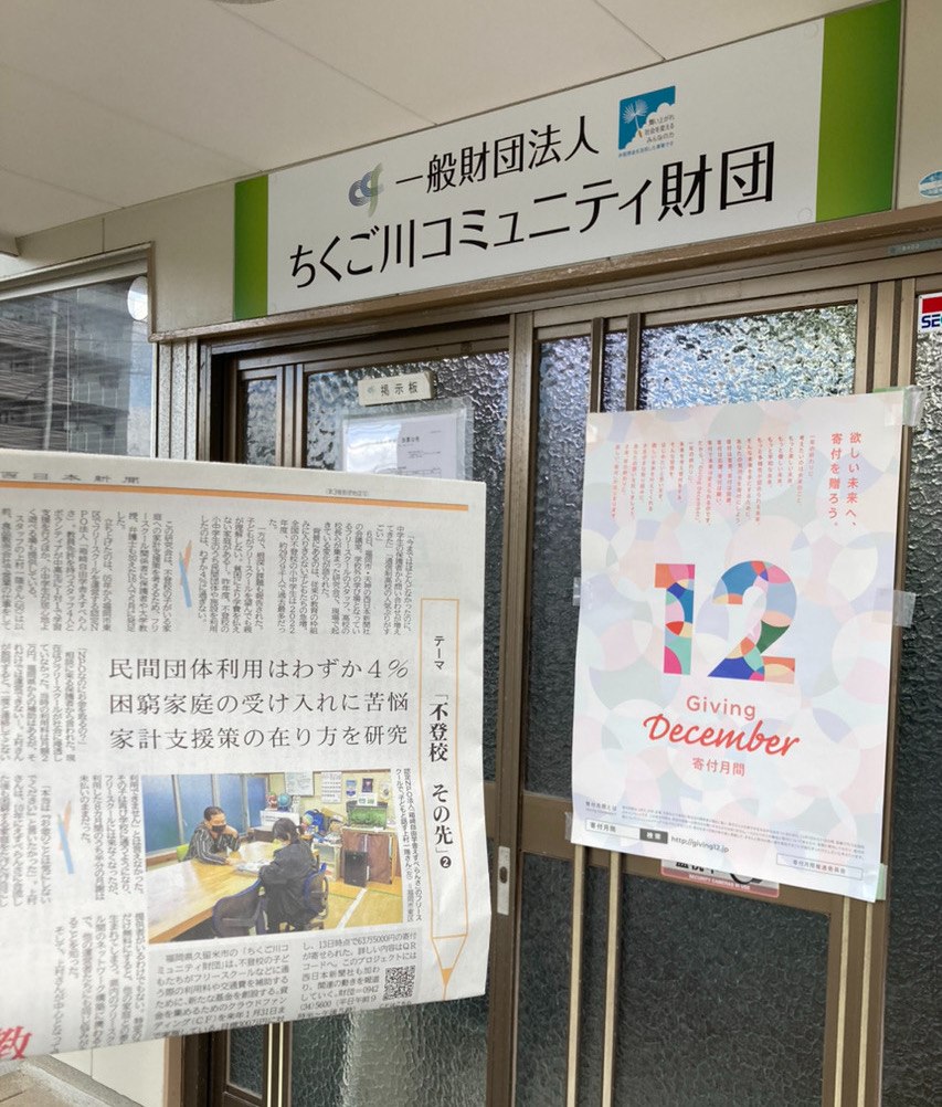 記事に取り上げられている認定NPO法人箱崎自由学舎えすぺらんさは、2005年から続くフリースクールです。ちくご川コミュニティ財団は「休眠預金等活用事業」を通して、えすぺらんさ含む3つの団体と一緒に不登校の子どもたちの支援事業に取り組んでいます。